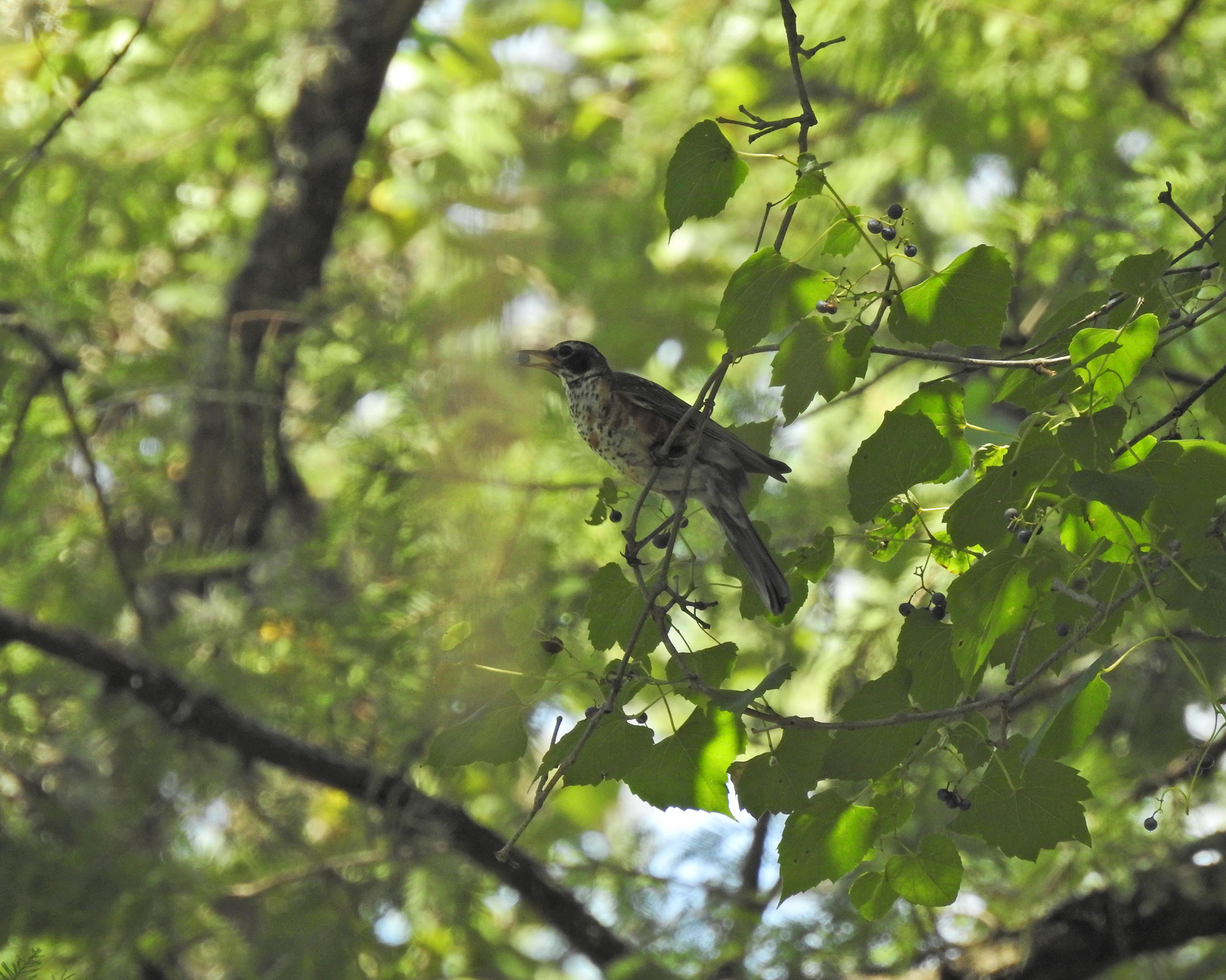 Robins that had three or four broods may still be raising young. As day length grows shorter, robins become restless and social. Flocks of robins are on the move, filling up on plentiful fruits and juicy berries. They are building up their body fat as fuel for fall migration.