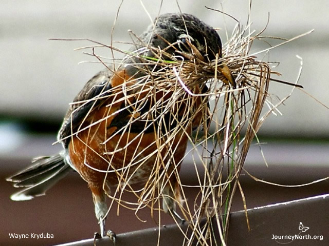 Robins don't need written instructions for building their summer homes. They follow the "nest-building blueprints" in their brains, and instinctively know how to build the perfect structure to hold the eggs they're about to lay. Robins' nests are always alike, but have you ever seen a robin teaching another how to build a nest?
