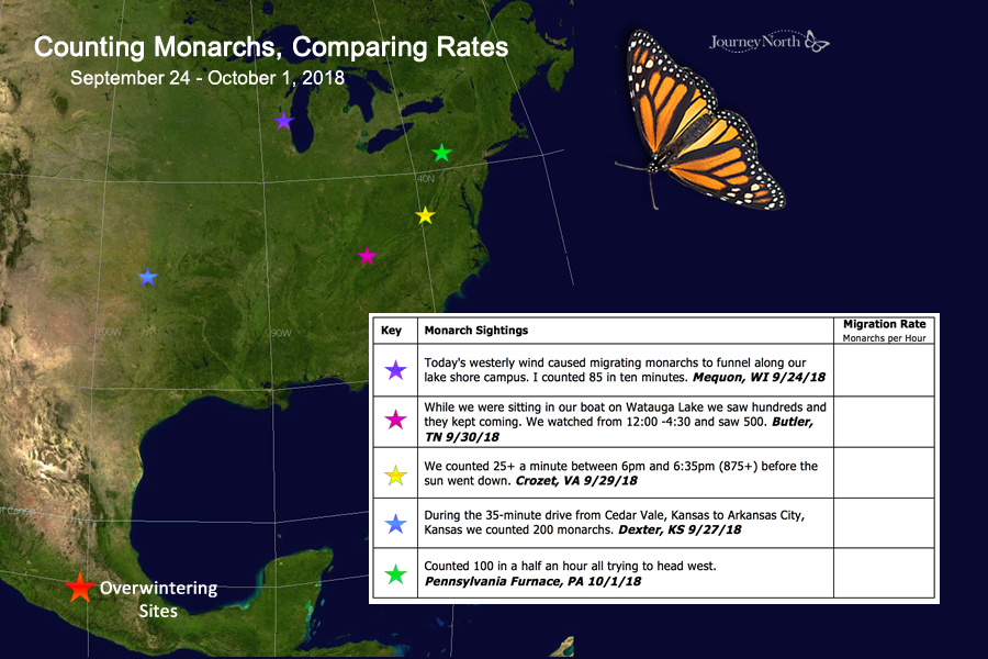 Use Journey North News Updates to drive instruction. Each update includes a journal page with a question to explore, an activity to try, a map to analyze and more. Over the season, the journal becomes a workplace where students explore ever-changing events, record compelling questions, formulate hypotheses, and document discoveries.