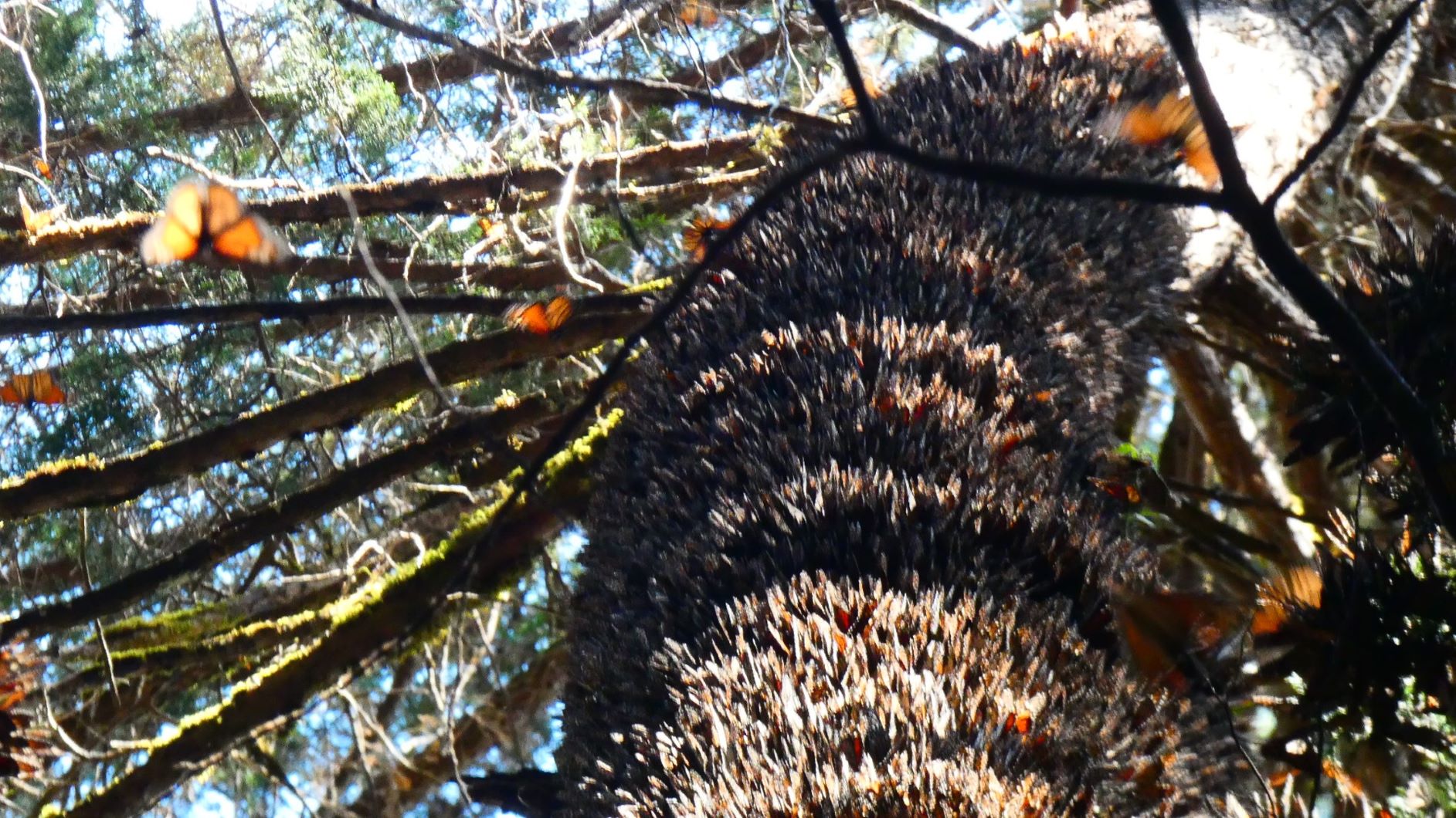 Butterflies Clustered on a Tree Trunk, El Llano Butterflies clustered on a tree trunk in El Llano. The older growth trees on this side of the mountain provide more protection to the colony. Photo by Pato Moreno