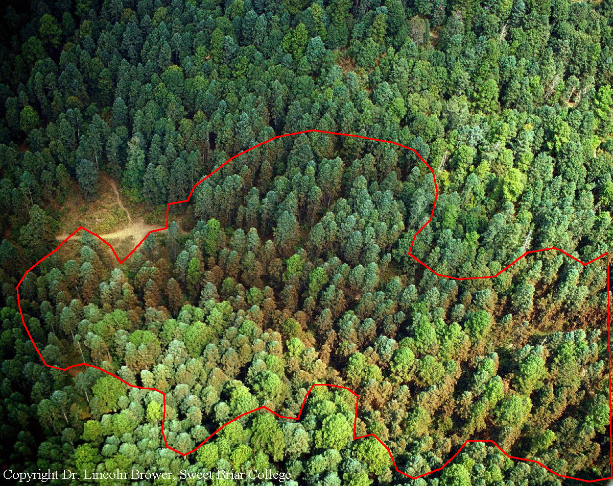 This is an aerial view of a monarch butterfly colony. In order to estimate the area the colony covers, scientists walk through the forest and decide which trees contain enough butterflies to be considered part of the colony. They visit all 12 overwintering sites, measure the perimeter of each colony, then calculate the total area of forest the butterflies occupy.
