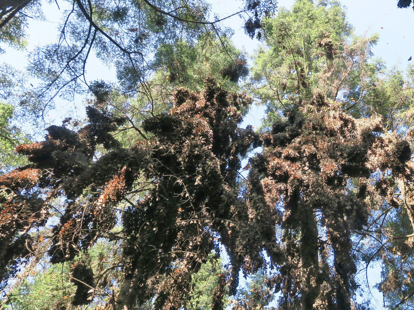 At El Rosario Sanctuary, Estela Romero highlights a large monarch colony at a site that usually only sees monarchs later in the season. Estela writes, "At the time of this reporting, monarchs in El Rosario Sanctuary occupy three different sites. Early in December, Los Orcones and Los Letreros colonies were very active and large; now they are much smaller. Just a few hundred meters north, a colony has formed that is dense and concentrated. A beautiful mass of stunning monarch butterflies can be seen in the Oyamal fir trees. It is only mid-December, yet monarchs are settled at Las Arenitas colony, a site they usually move to in February."