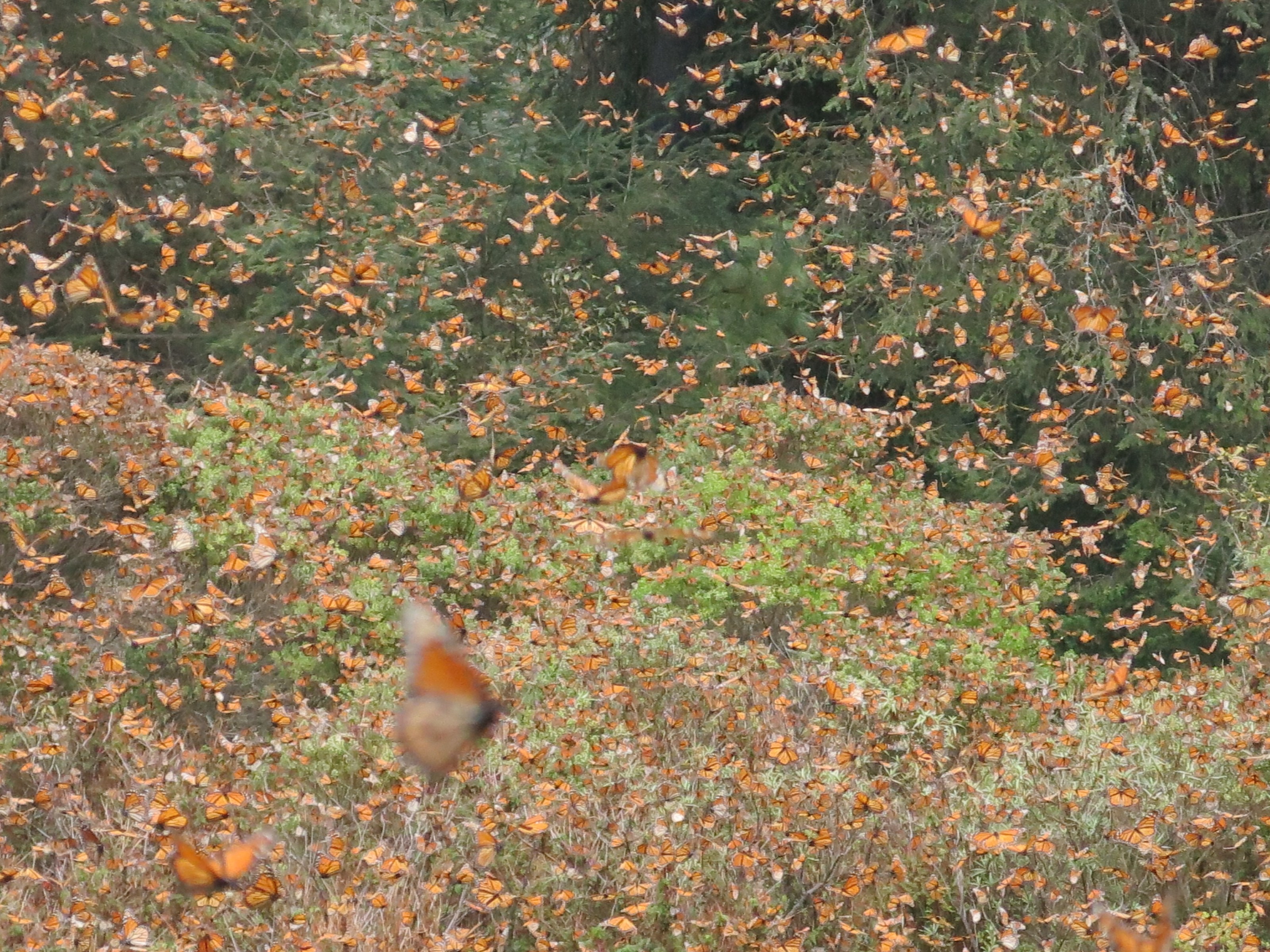Butterfly behavior is at its most spectacular now. In the sanctuaries you might see a blizzard of butterflies — flapping, gliding, mating, drinking, and bursting from their clusters.