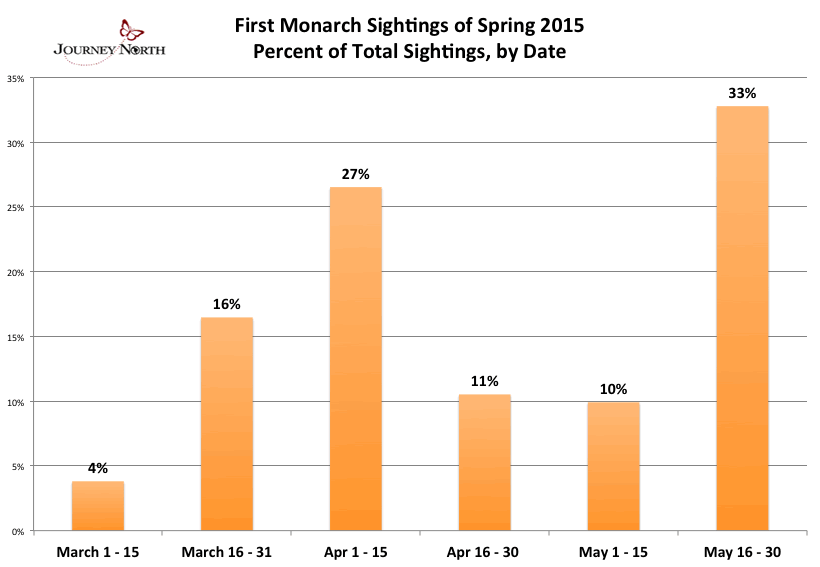 Watch for a dramatic upsurge perhaps next week. This sightings chart -- from 2015 spring season -- shows the typical surge that occurs during the second half of May. Watch the migration path to determine when it will reach the end of the milkweed trail? Keep an eye on the wind and temperature map too.
