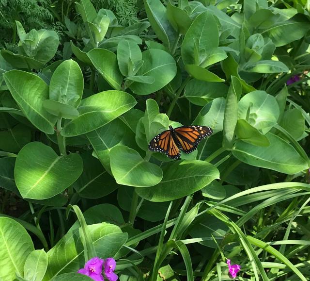 From Wadesville, IN: Tom reported what "looked like a female that had over-wintered in Mexico. She was pretty faded, and tattered and doing an egg dump on different patches of common milkweed and butterfly weed." (05/09/2019)