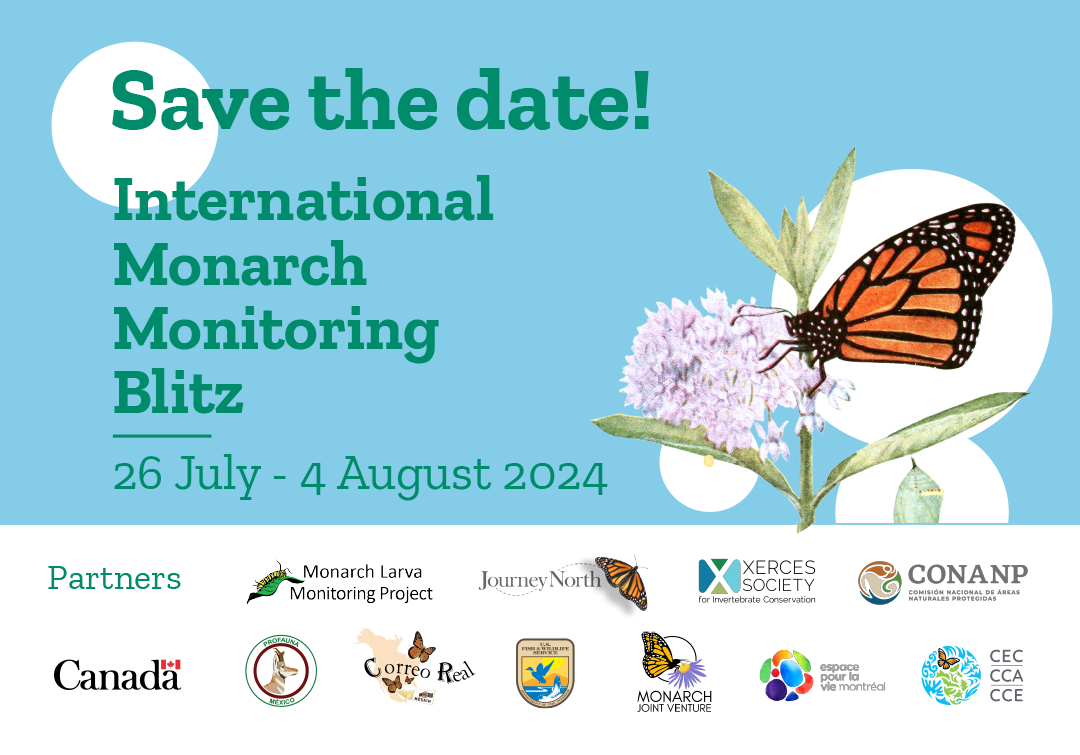 The Blitz is organized by the Trinational Monarch Conservation Science Partnership, a collaboration of organizations, including the Commission for Environmental Cooperation (CEC), Insectarium/Montréal Space for Life, Environment and Climate Change Canada (ECCC), the Monarch Joint Venture, Journey North, the U.S. Fish and Wildlife Service, the Xerces Society for Invertebrate Conservation, PROFAUNA AC/Correo Real Program, and Mexico’s Comisión Nacional de Áreas Naturales Protegidas (Conanp).