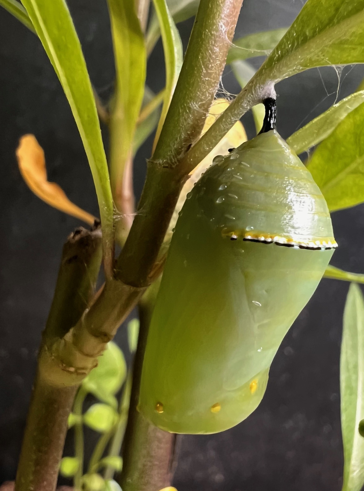 The chrysalis on a potted plant in my garden is still green. Monarch nectar plants, including Pacific Aster (Symphyotrichum chilense) and native yarrow in the state park garden, are all growing well, and I hope will all be blooming if and when the monarchs return in the fall.