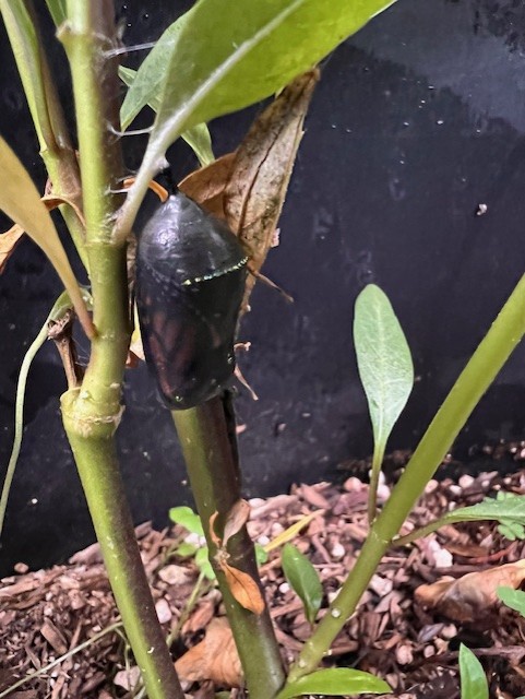 The chrysalis that pupated on the milkweed in a pot turned black overnight and will likely eclose today. Assuming it can fly, I’ll tag it with a SWMSTag before releasing it onto blooming Symphyotrichum chilense in my garden. Still have one or two monarchs flying about from time to time, but it’s been cool and overcast here, so hardly seeing any. It’s expected to be sunny and warmer over the next few days.