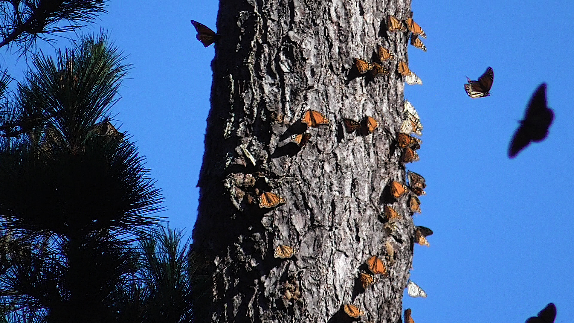Susan brought in the New Year finding 6 monarchs in El Segundo, California, on January 1. “Noon, clear sunny day after 2 days of record rain. Free flying then landing to sun in tall pine trees.”