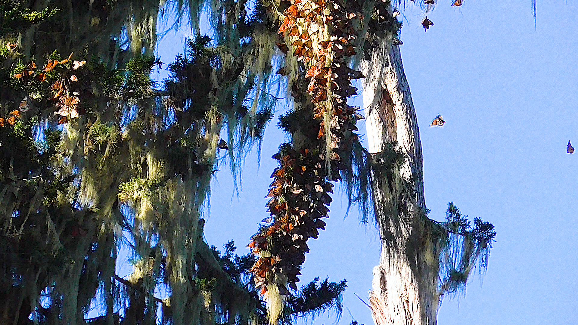 “Saw very few at Natural Bridges on Sunday, but they were flying very high above the trees and very few clusters noted. Some may have moved to Natural Bridges, which is not uncommon. You may notice that several are still hanging under the cypress branches, wings closed, which is their normal behavior during cold rainy days (which we’ve been having). That protects them from the rain and cold frost if it comes. I just caught some of them opening their wings and basking in a little sunshine! It was warm enough to fly, and several did."