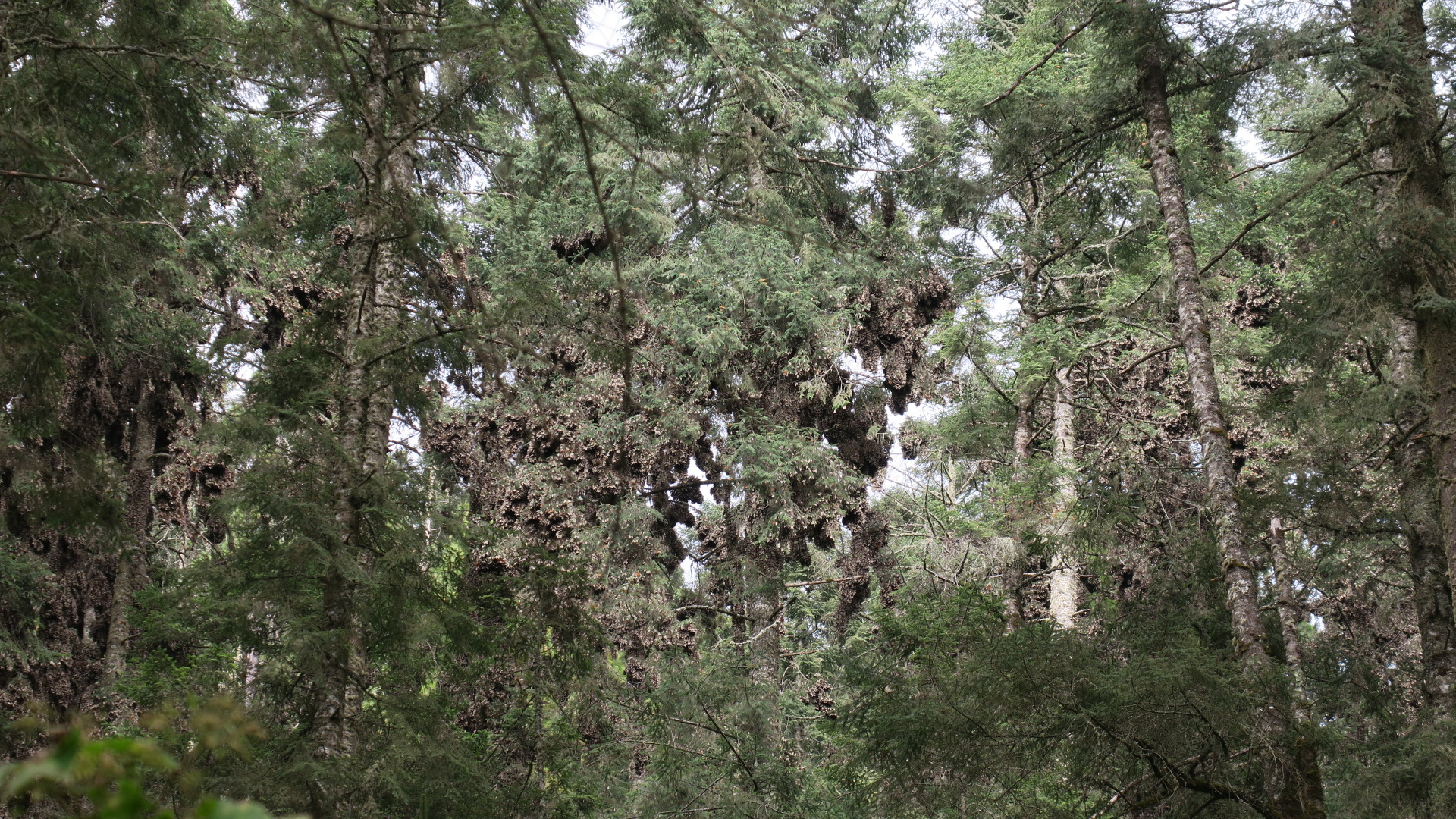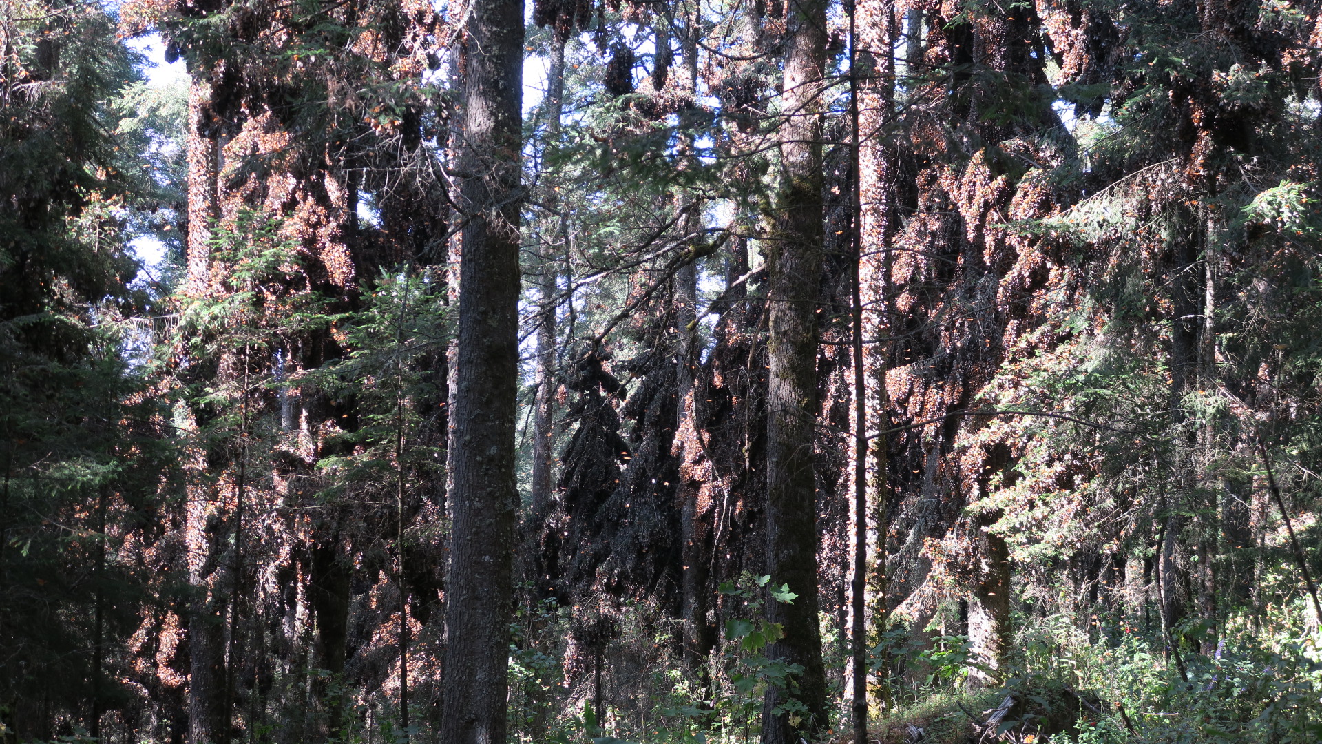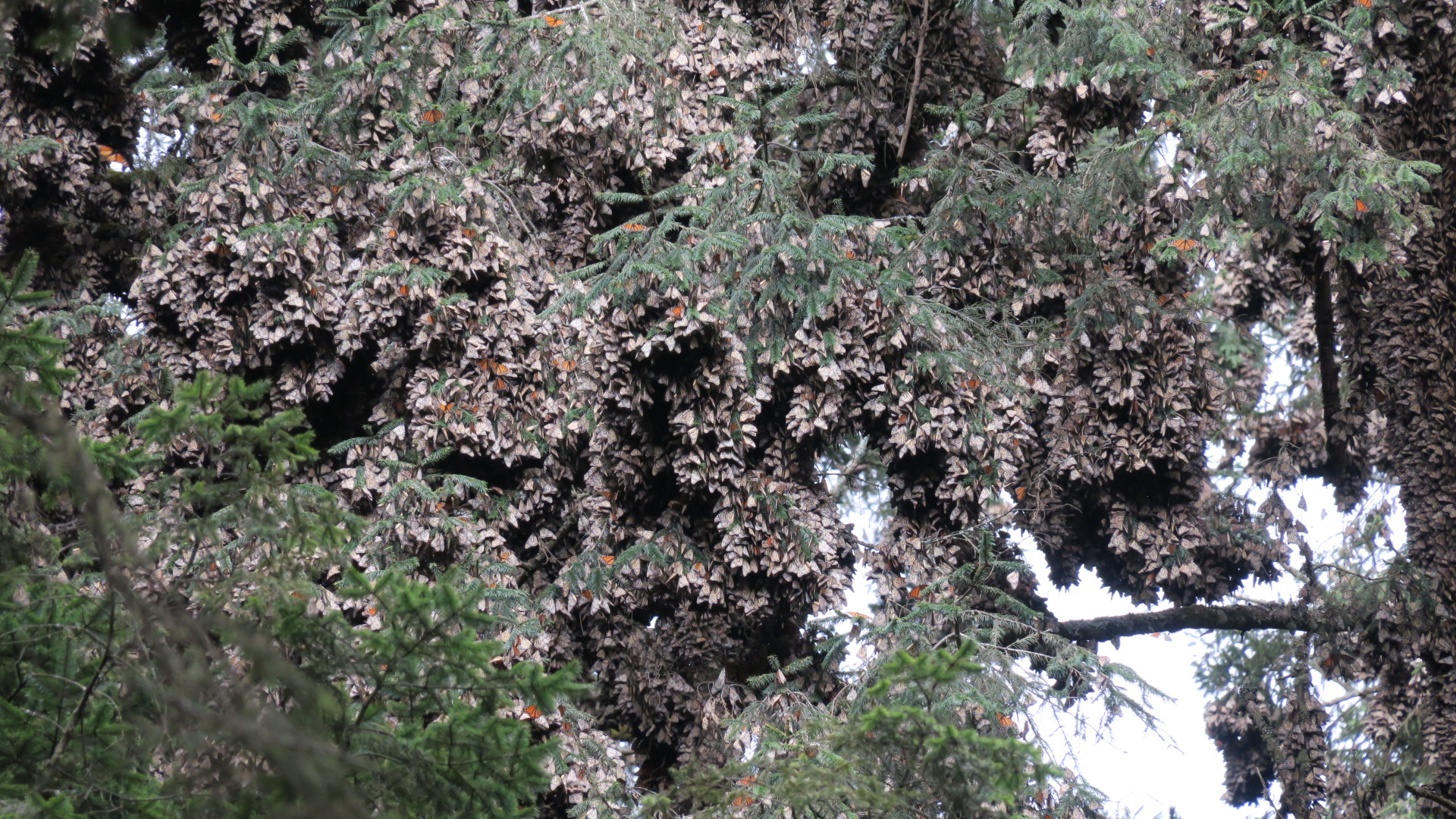 A pesar del cálido invierno hasta ahora, las Monarcas parecen mantenerse estables y quietas en sus áreas de hibernación en ambos Santuarios.