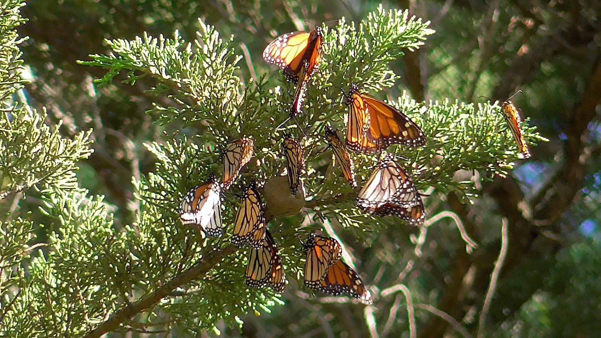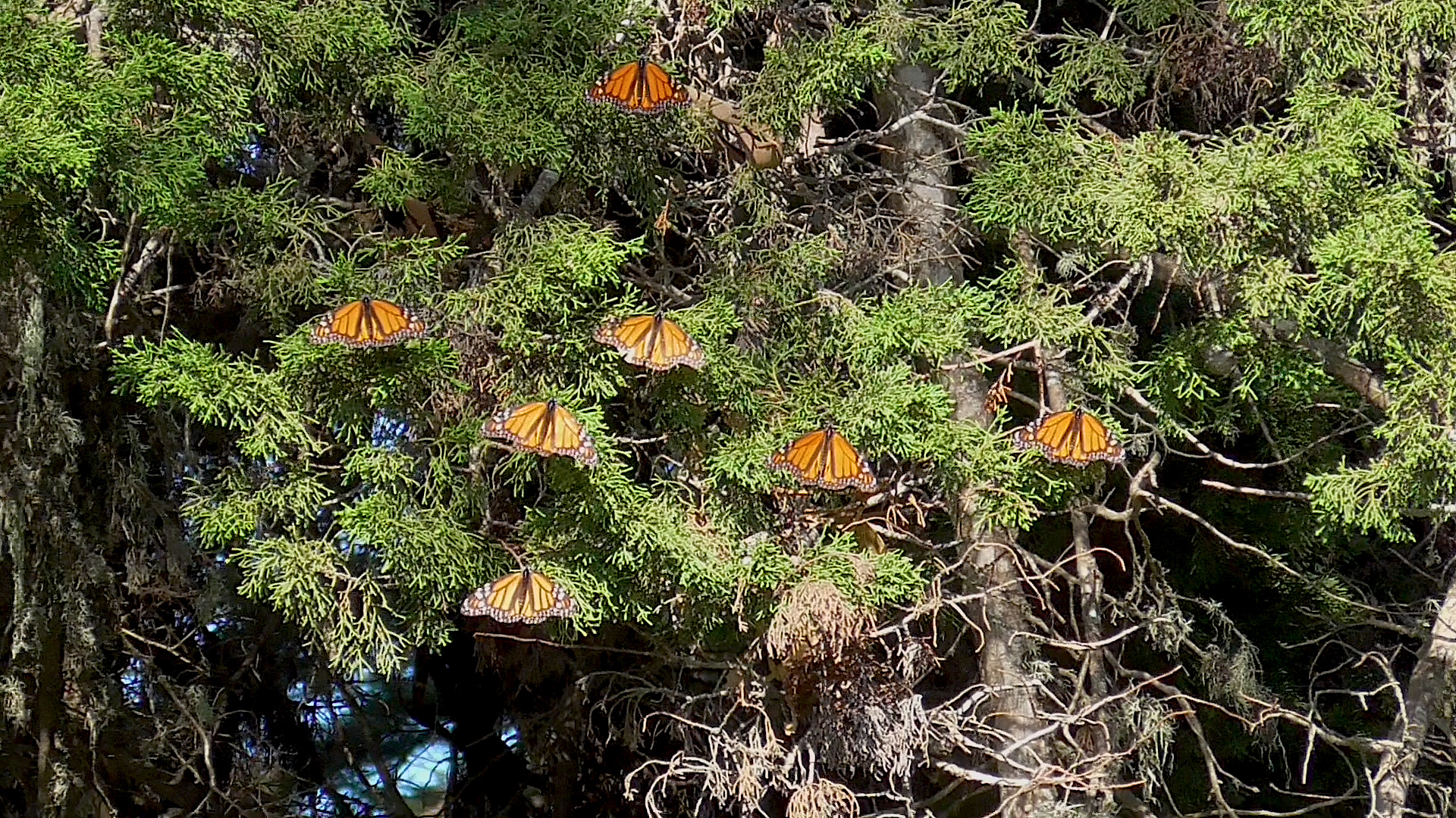 “They have definitely reconfigured themselves. The concentrations of them dispersed much higher across the canopies of the Monterey Pine trees. The Monterey Pine #28, we dubbed ‘Charlie Brown,’ which hosted at least 5,000 monarchs on 1/7’s count, only has 56 monarchs clustered on it now!