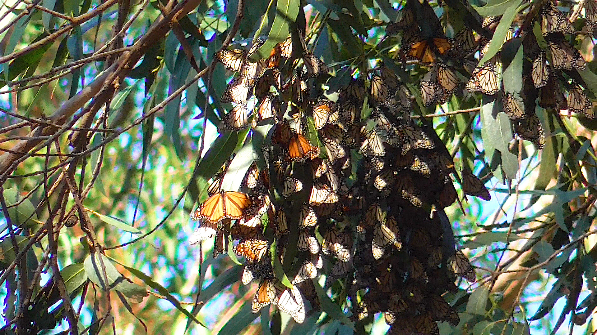“We did find a few small clusters on the back side of the Eucalyptus on southern end of the sanctuary along the fence line of the neighbor’s yard. The monarchs haven’t been there all season. Approx. 2,000 are clustered between 3 Monterey Pines along the visitor path. They had moved from these trees in mid-November and hadn’t been back there until last week. While there, we experienced multiple bursts of monarchs some tallying 20 and then later in the morning 100-200 monarchs!