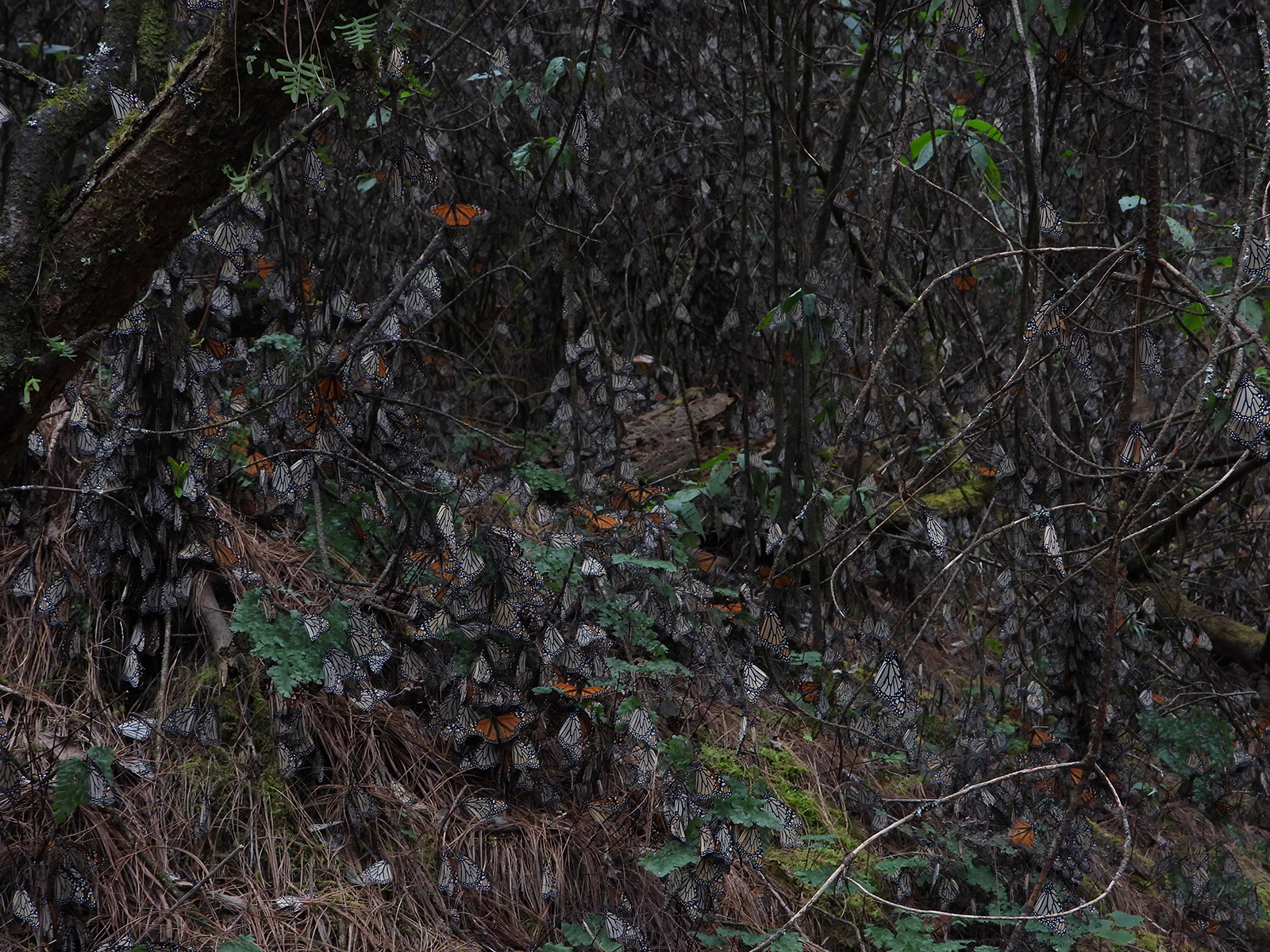 On January 16th, we could see only one small branch of an oyamel fir tree was broken from the storm. It was covered with butterflies, and all of them on that branch were on the ground and couldn’t fly. Over the course of the day the sun warmed them up a little bit and most of them were able to climb at least on some shrubs or dry branches that were nearby, and this saved them from dying. Although the forest is young, and even if the trees are not as high to protect them, the place where the butterflies are is more dense and that helped to protect them.