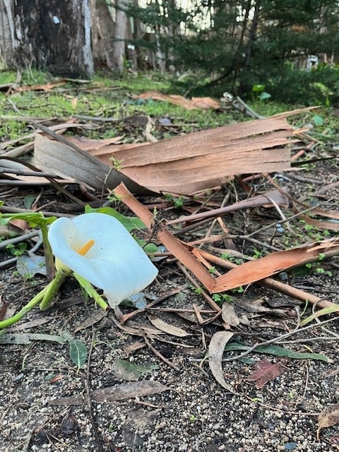 “Walking into the 40 degree monarch habitat with Eucalyptus debris everywhere didn’t make me worry any less. Remarkably, other than the bark strips and small branches everywhere, the trees were all still standing. The monarchs were also visible soon enough. The majority of them are positioned on the east side on a Monterey Cypress, which often hosts the monarchs in this later part of the season, due to the abundance of lace lichen all over it. There are currently 1,690 monarchs on this tree alone. The rest of the monarchs are on the group of Monterey cypress and Monterey pines which are in the northern and northeastern portion of the grove. As expected, they are high up and mostly on east east-facing sides of the trees to receive the sun as soon as possible. We counted them clustered in 8 trees, including “Nexus” the Monterey pine in the southern end, which was the only tree in a different location than the majority of the monarchs. Our count this morning, 2/9/24, was 2,498 monarchs (2,462 clustered and approx. 30 grounders, mostly in and around the base of a tree in the deep north).