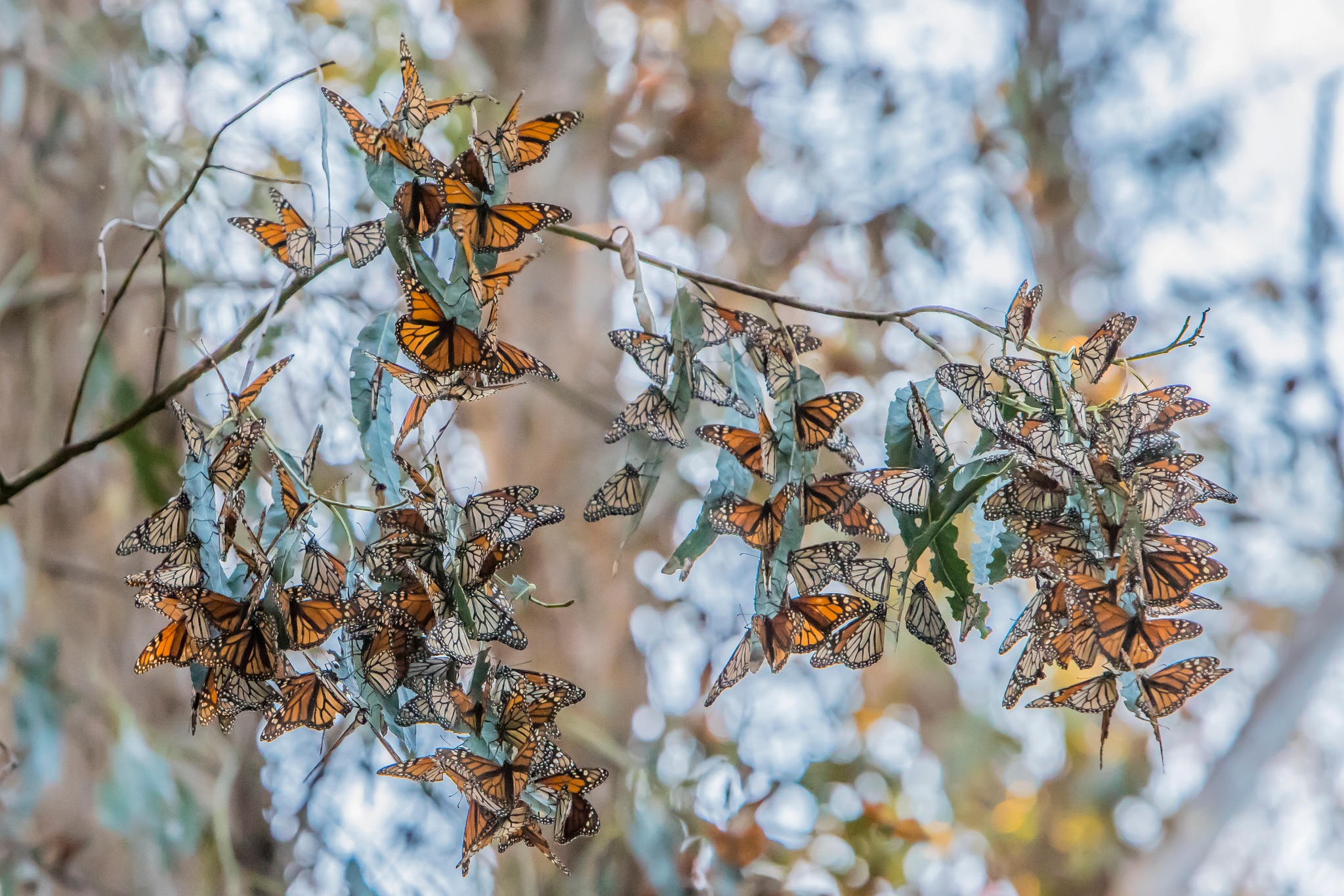 “Pismo Monarch Grove is starting to see decreasing numbers of monarchs. In the evenings there are now many small clusters spread throughout the trees. The monarchs moved to the eastern and western areas of the grove with clusters facing open areas instead of in the more protected inner grove. As usual for Valentine’s week, mating is very common.”