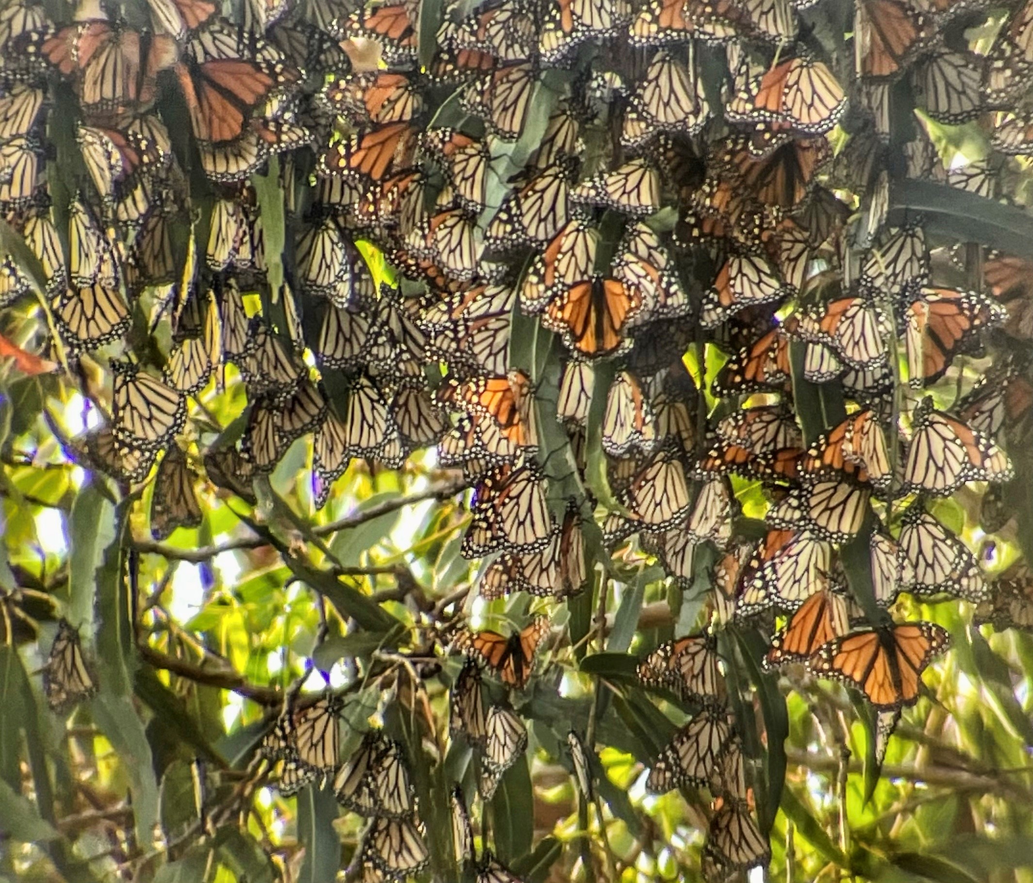 Cooler temperatures allowed us to count 2,804 monarchs, the morning of February 18th, 2022. The monarchs have once again, changed their positioning in the sanctuary as to be primed and ready for the sun and warming temperatures of the day. They are mostly in the southern portion of the sanctuary, clustered on many of the Eucalyptus trees and very high up. They are also in the neighbor’s yards on the backsides of the same Eucalyptus trees and on a Monterey Pine which has been a favorite roosting spot of monarchs in years past. This south facing side, in the neighbors’ yards, gets a great deal of sun early in the morning and remains sunny throughout the day-therefore there many monarchs are utilizing that area, outside what is considered the PG ‘monarch sanctuary.’ There is also a Monterey Cypress overhanging the adjacent hotel’s fence on the east side of the grove. This tree now also has a few clusters. This tree, too, was utilized in years past by the monarchs at the end of the season-but only at the end.