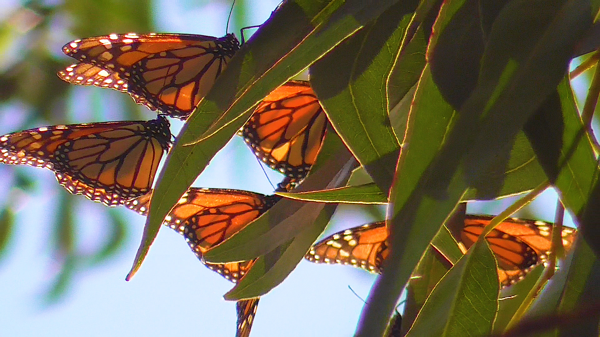 “I observed 4 male Monarchs roaming the garden area and basking in the sun 15 - 20 feet above the ground amongst multiple Live Oak Trees. Photo has 2 males; one at right and left edge.”