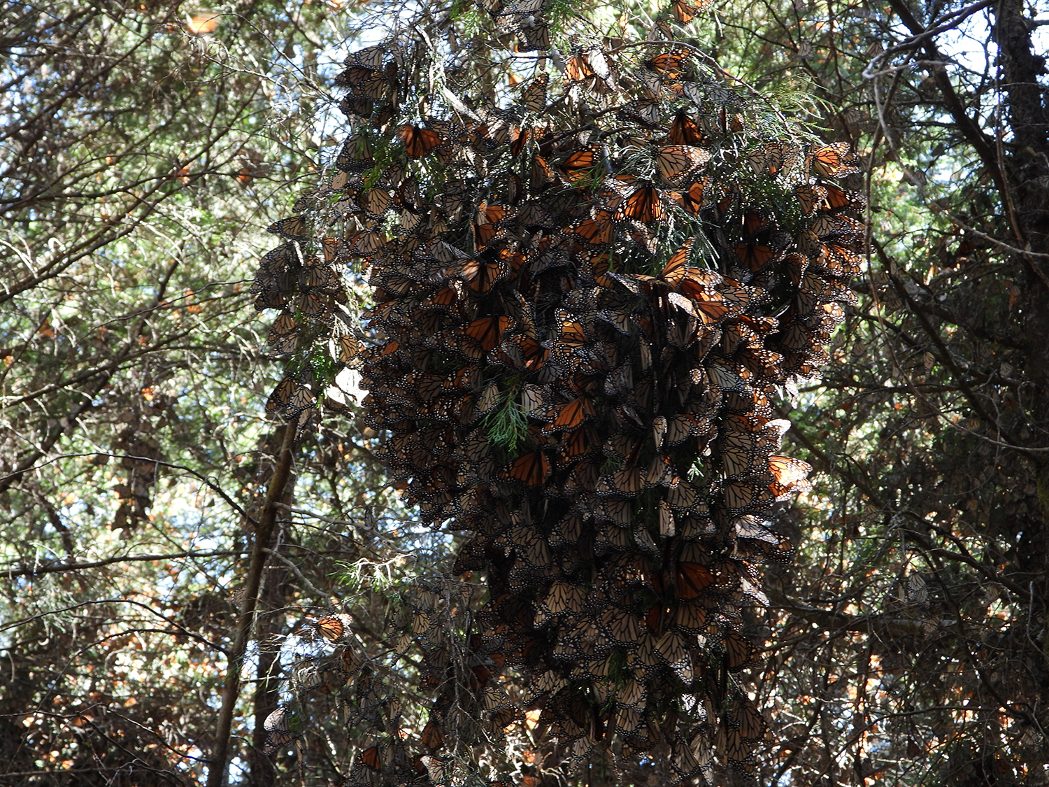 Por un momento pensamos que la última semana que íbamos a ver las mariposas en colonia en Cerro Pelón seria la semana pasada. Pero de acuerdo con los arbolistas de Butterflies and Their People, se observó otra pequeña colonia con alrededor de unos 15 árboles, cerca de la Lagunita. Estas mariposas se encuentran muy esparcidas y por la tarde se agrupan, parece que muy pocas de ellas van saliendo porque por las mañanas se pueden ver juntas. Probablemente en este lugar se juntaron las mariposas que venían de Piedra Herrada, con algunas de las que había en Cerro Pelón.