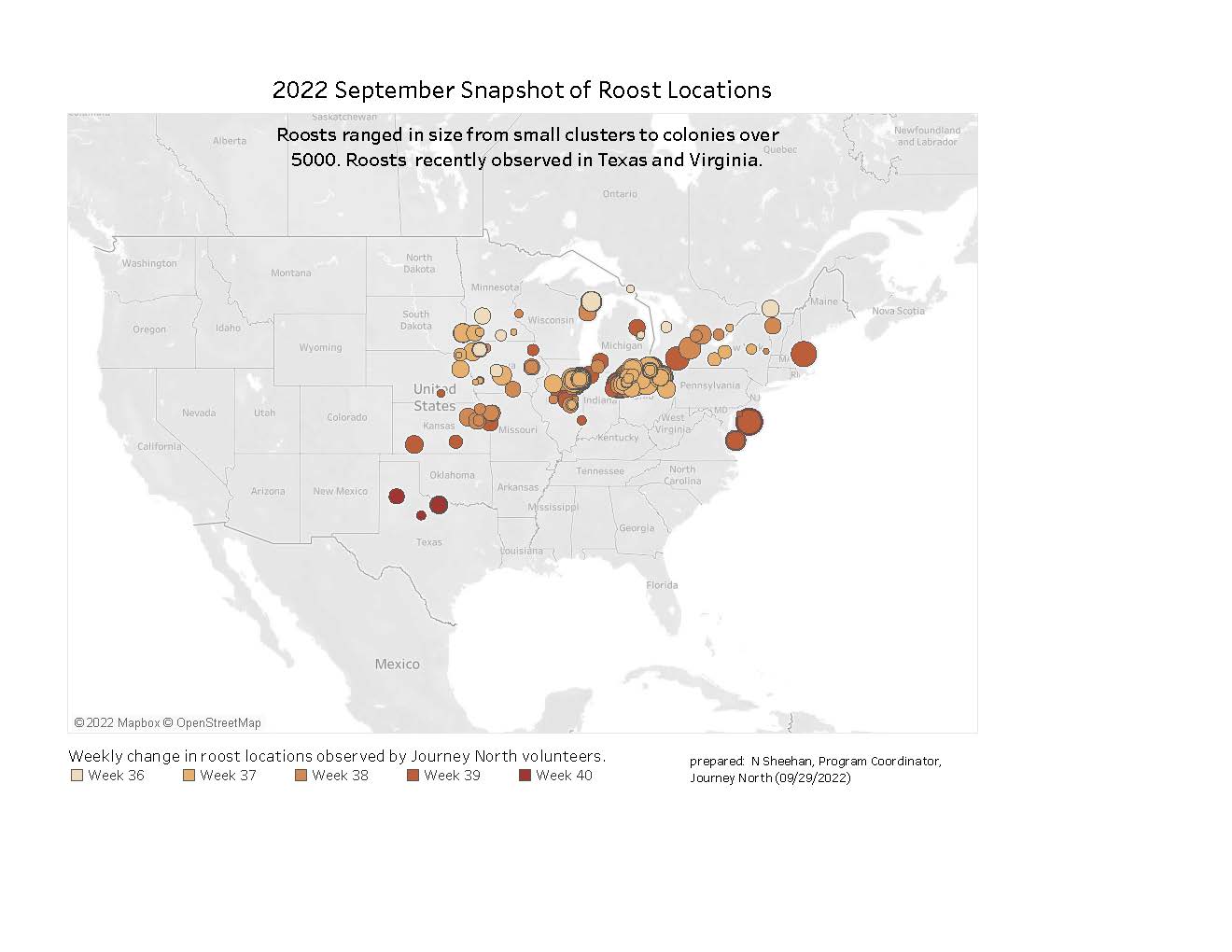 From peninsulas to coastal ports, Journey North volunteers are documenting monarch roosting behavior. Early in September, monarch roosts numbers kept increasing along the shores of the Great Lakes. Mid September, volunteers observed roosts in the central U.S. This week, volunteers are observing roosts in Texas. Along the Atlantic Flyway, the Delaware Bay and the Chesapeake Bay continue to be hotspots for roost activity.