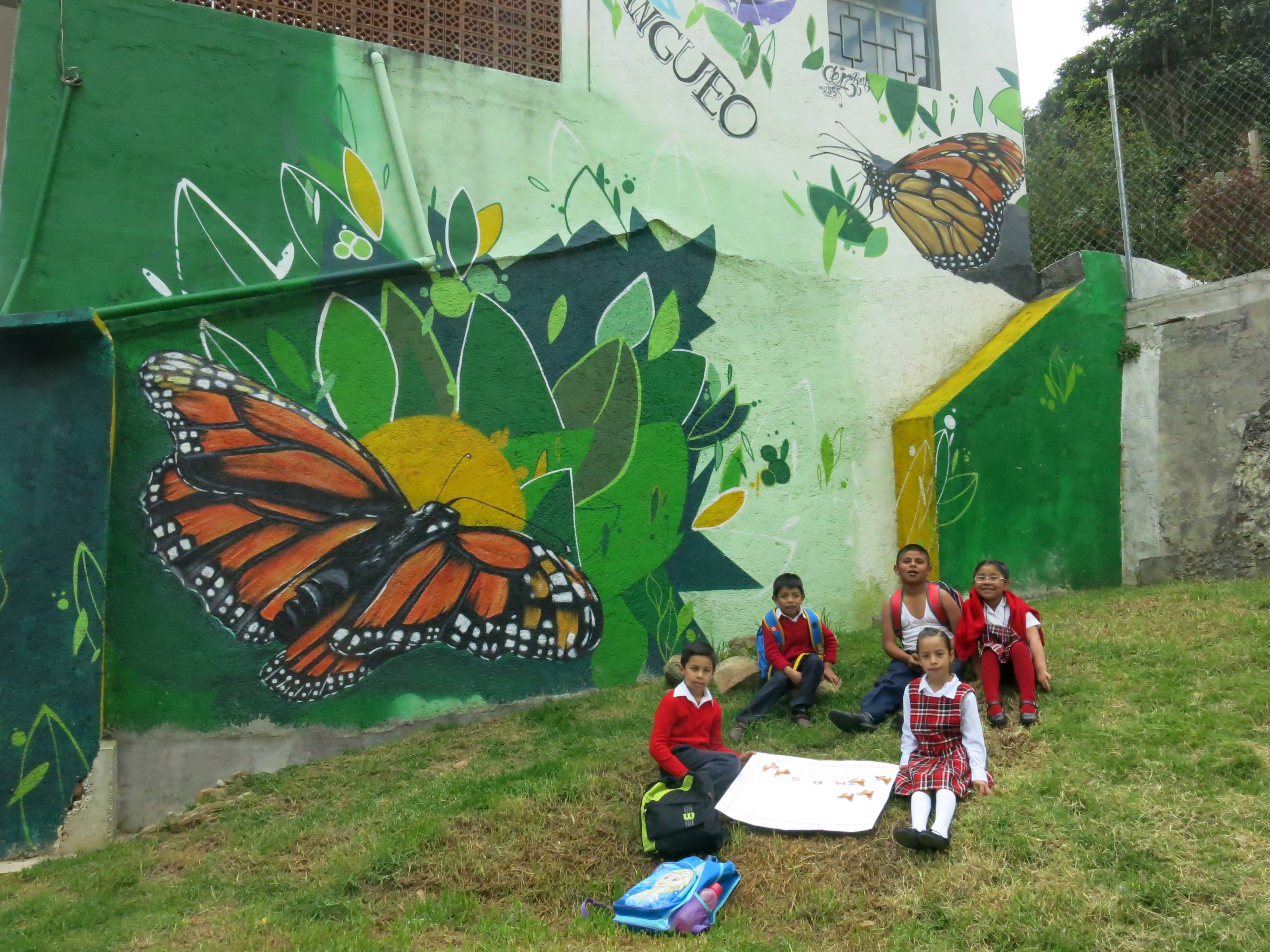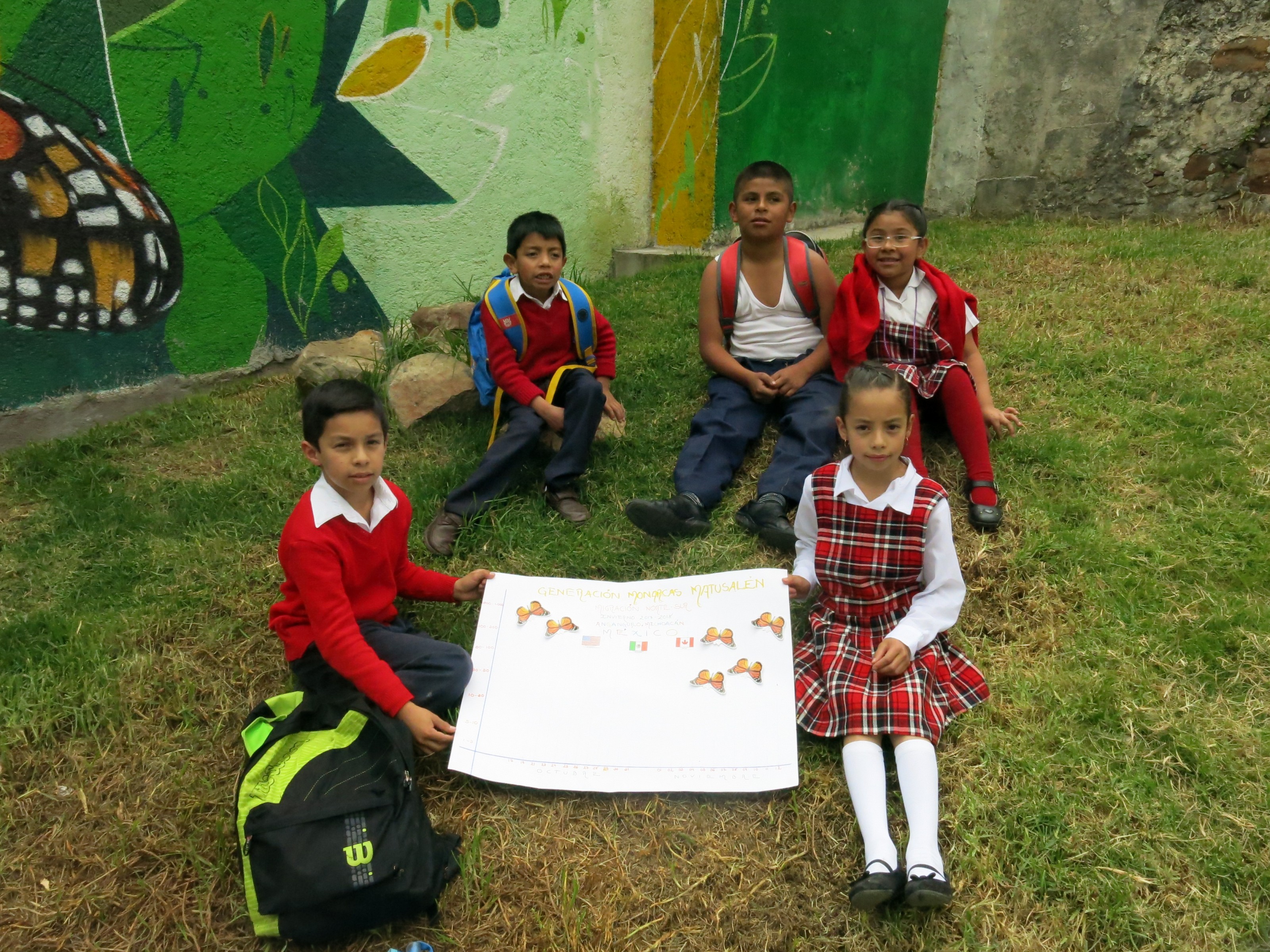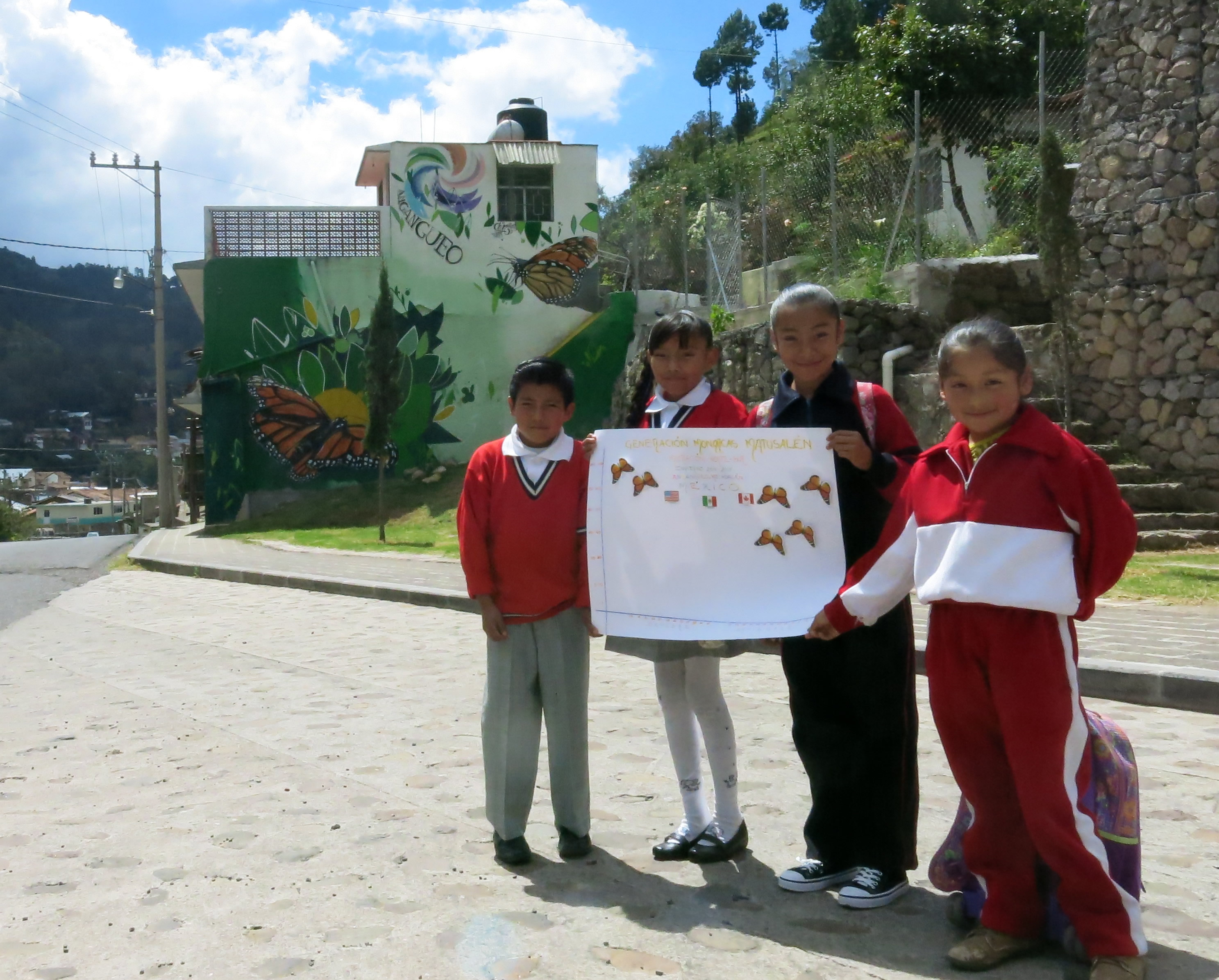 At the beautiful mural background, another group of friends asked me to send a message to Northern children living where Matusalén Monarchs come from. They told me: