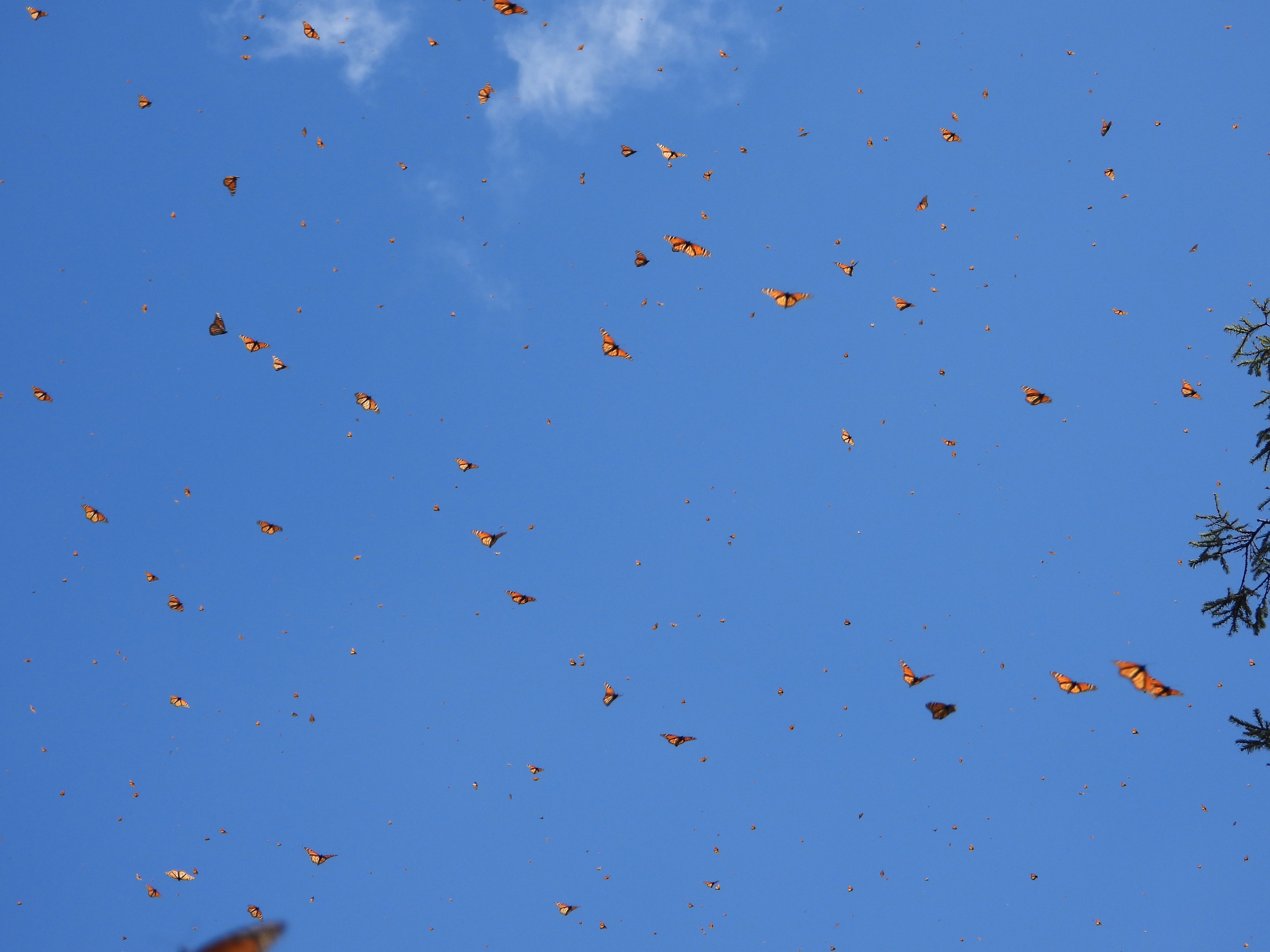 Just then a secret memo reached the monarchs. They poured forth from their trees all at once, filling the sky, pulling our attention upward.