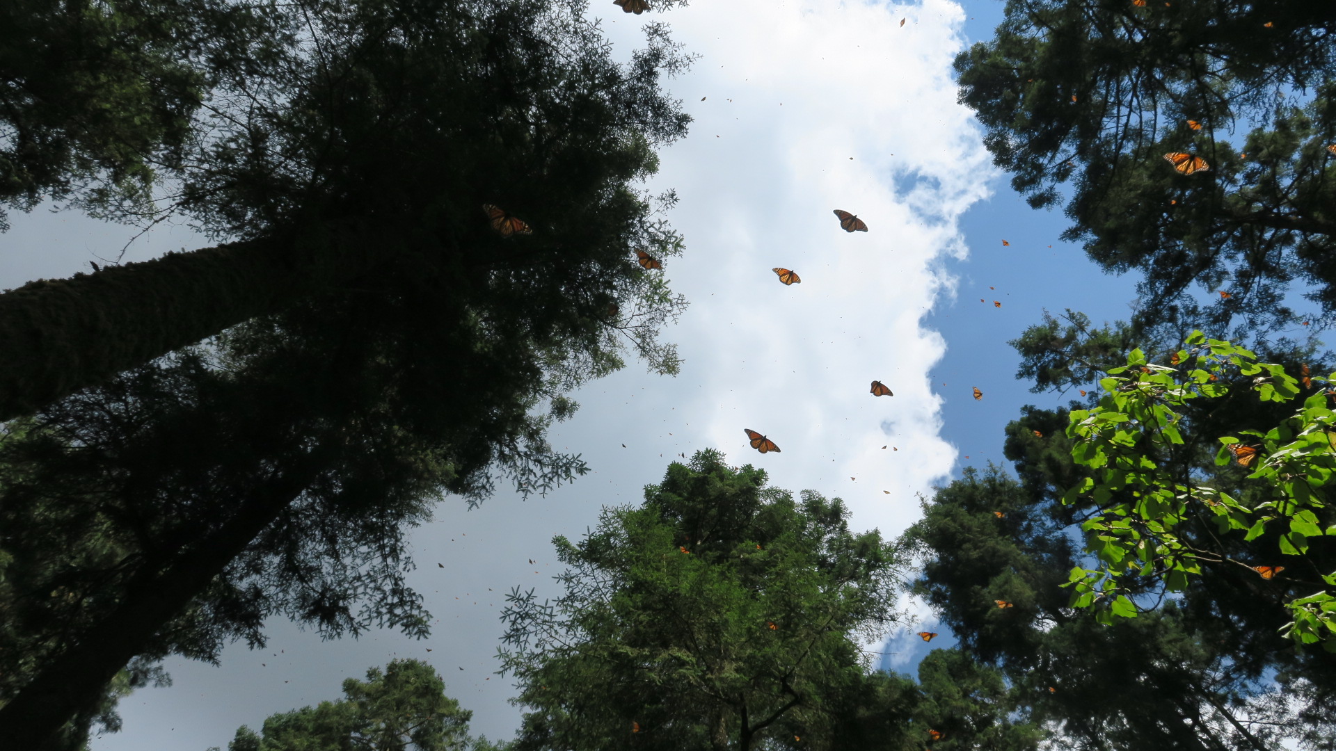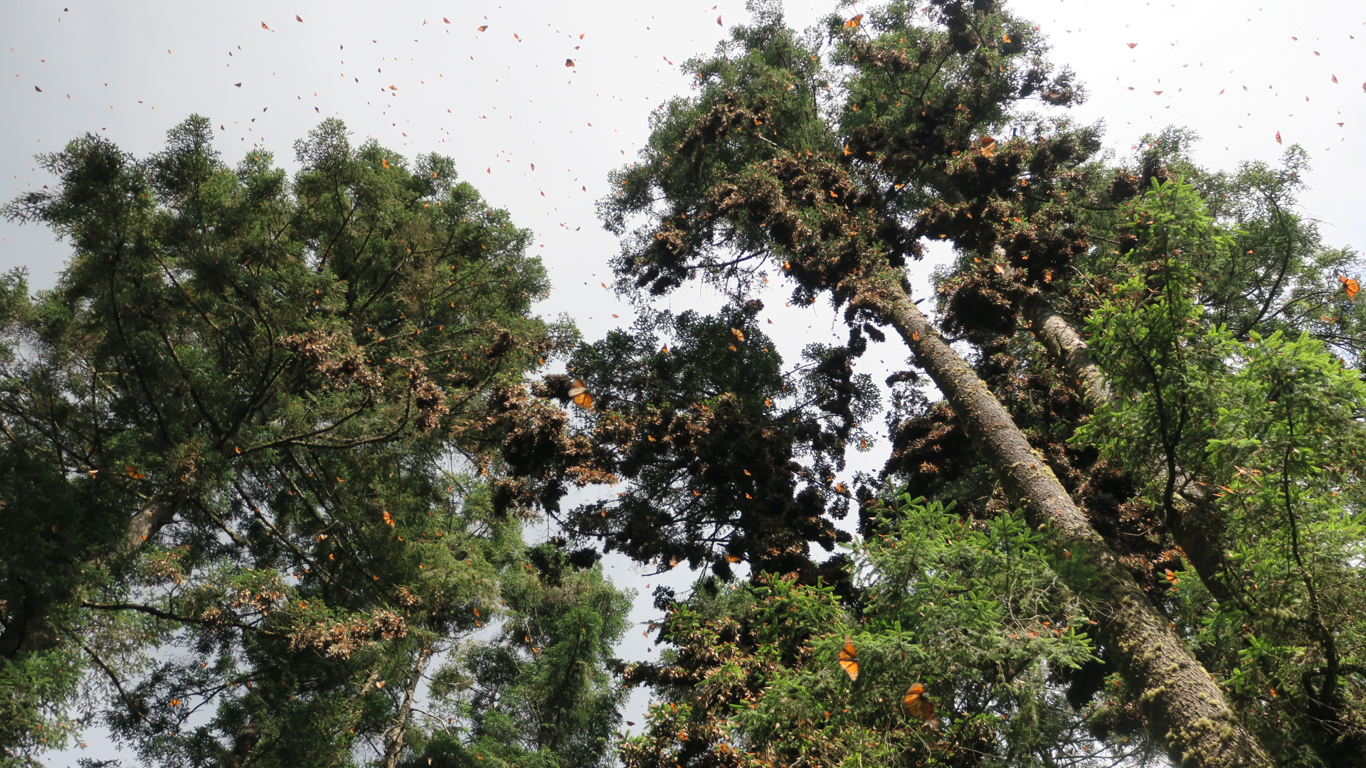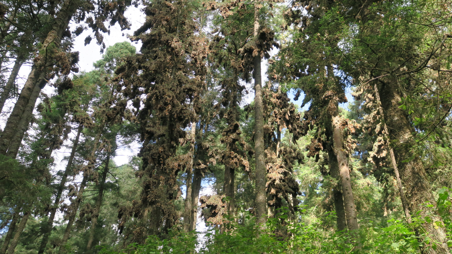 Tomó 40 minutos llegar al sitio de “El Zacatonal”. Maravillosa llegada masiva. Las Monarca han ocupado aquí un área más amplia que el “El Rosario” (alrededor de 100 árboles de Oyame), con racimos más pequeños y espaciados por todo el sitio, pero muy probablemente mostrando una densidad similar a la colonia “Los Letreros” en “El Rosario”.