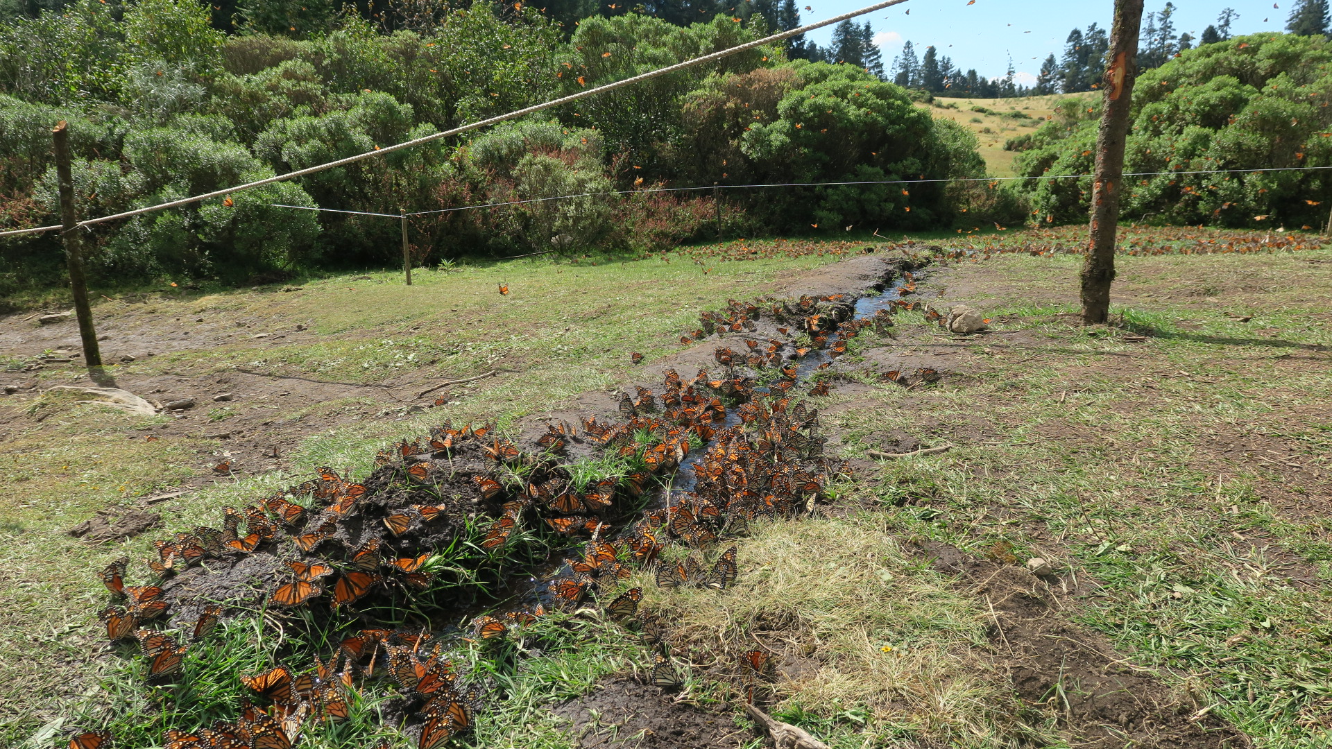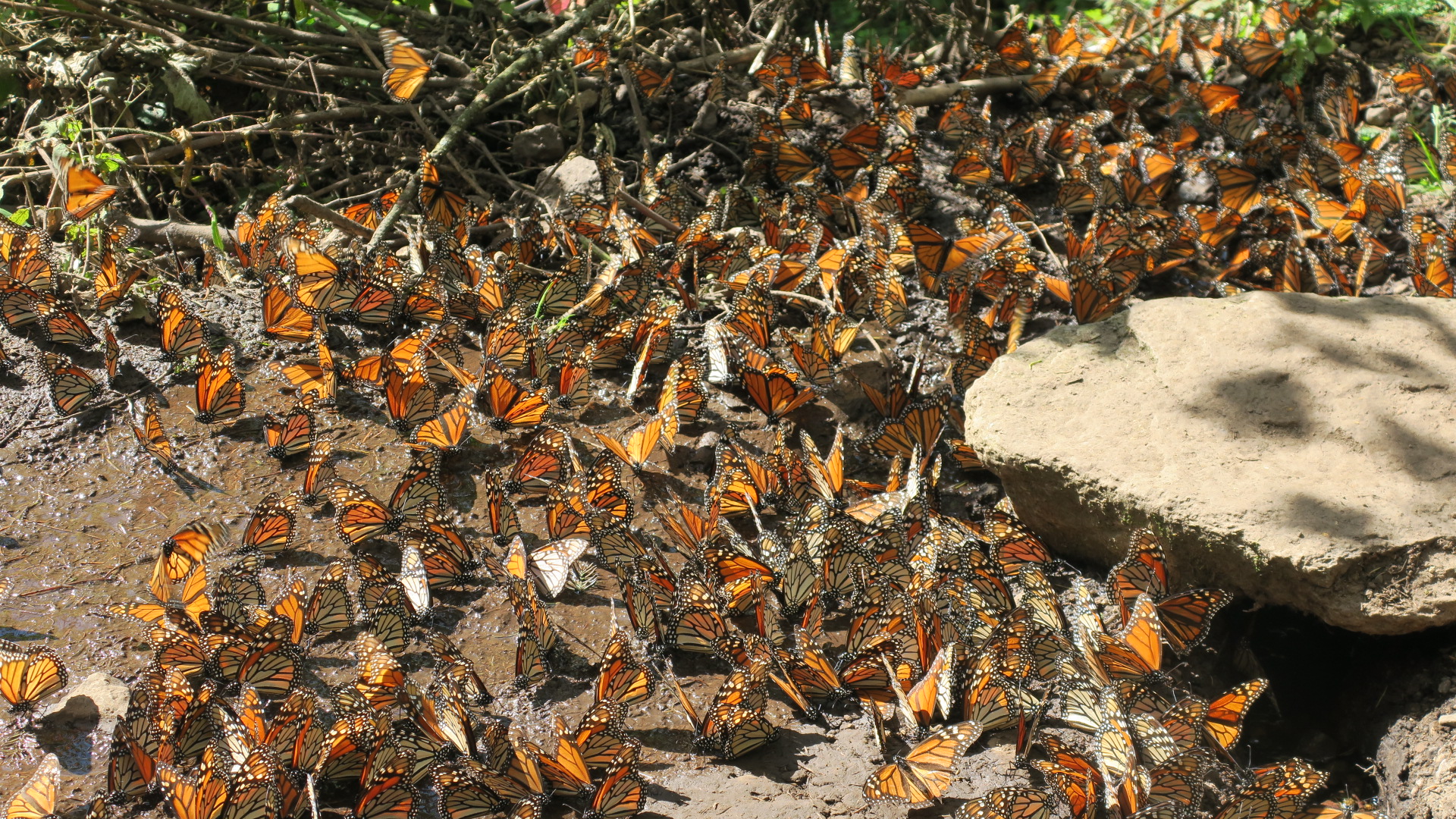 Se podía observar cómo una actividad inusual con grandes cantidades de mariposas se movían por doquier tomando sol y agua en cada área húmeda, charco o riachuelo, pereciendo esto más bien un hermoso día de Febrero en los Santuarios, cuando las Monarca están cerrando su fase de hibernación y se preparan para su apareamiento y finalmente, su salida.
