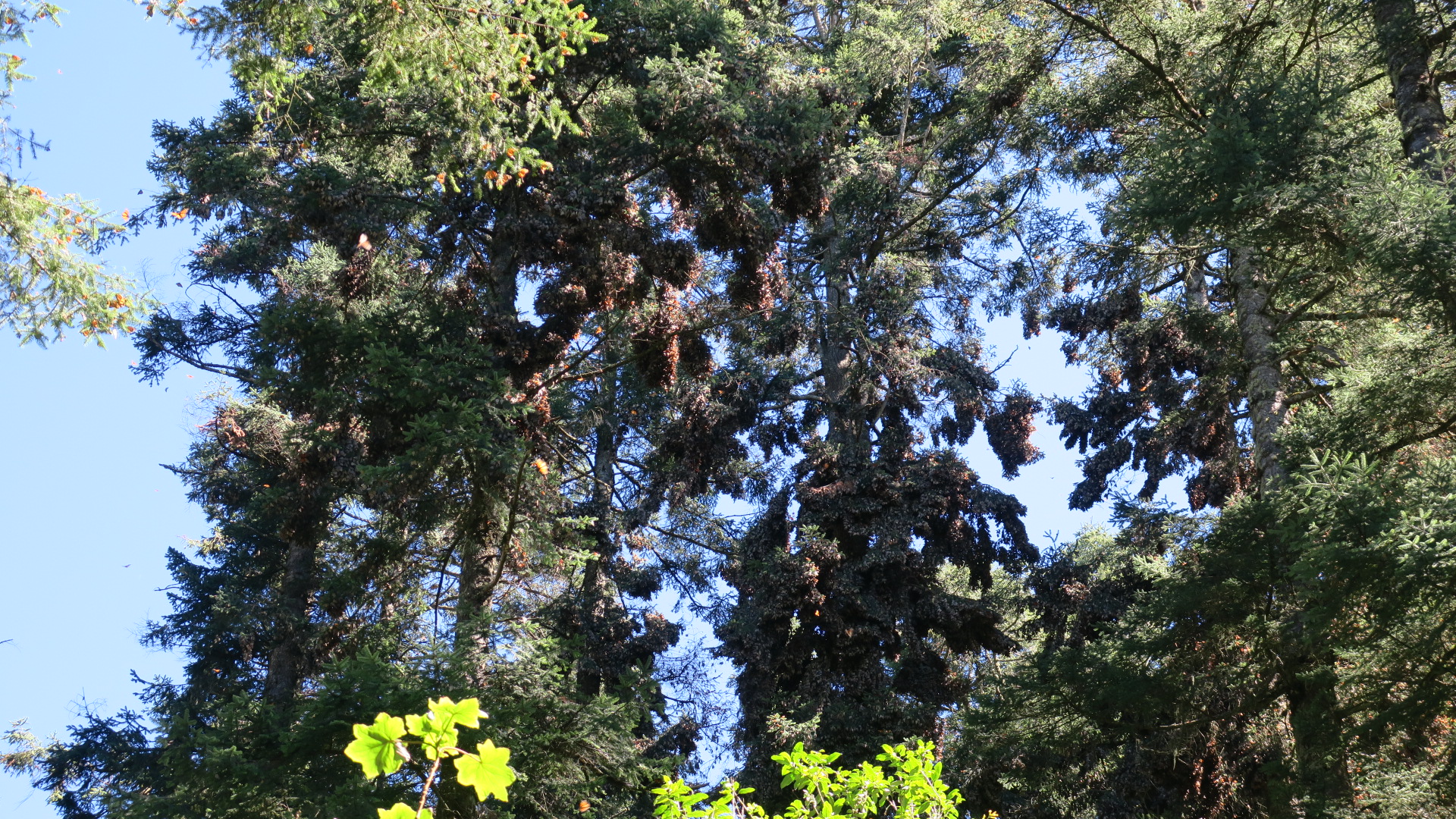 The Sierra Chincua Sanctuary Colony, located beyond La Casa del Japonés (19.6782259 -100.3012956), seems to have doubled to triple the butterfly population at this time compared to El Rosario. About 50 trees are already showing noticeable clusters.