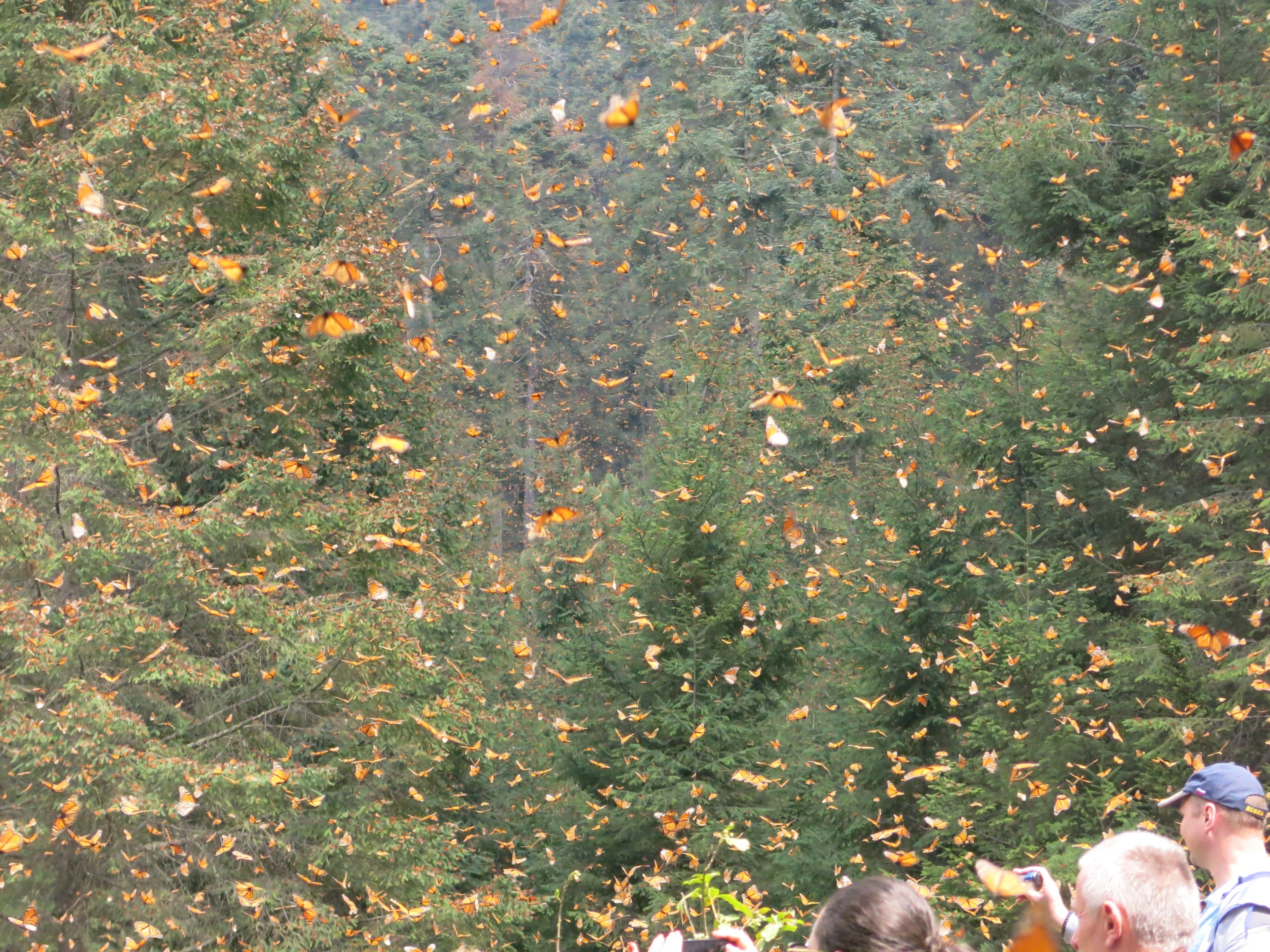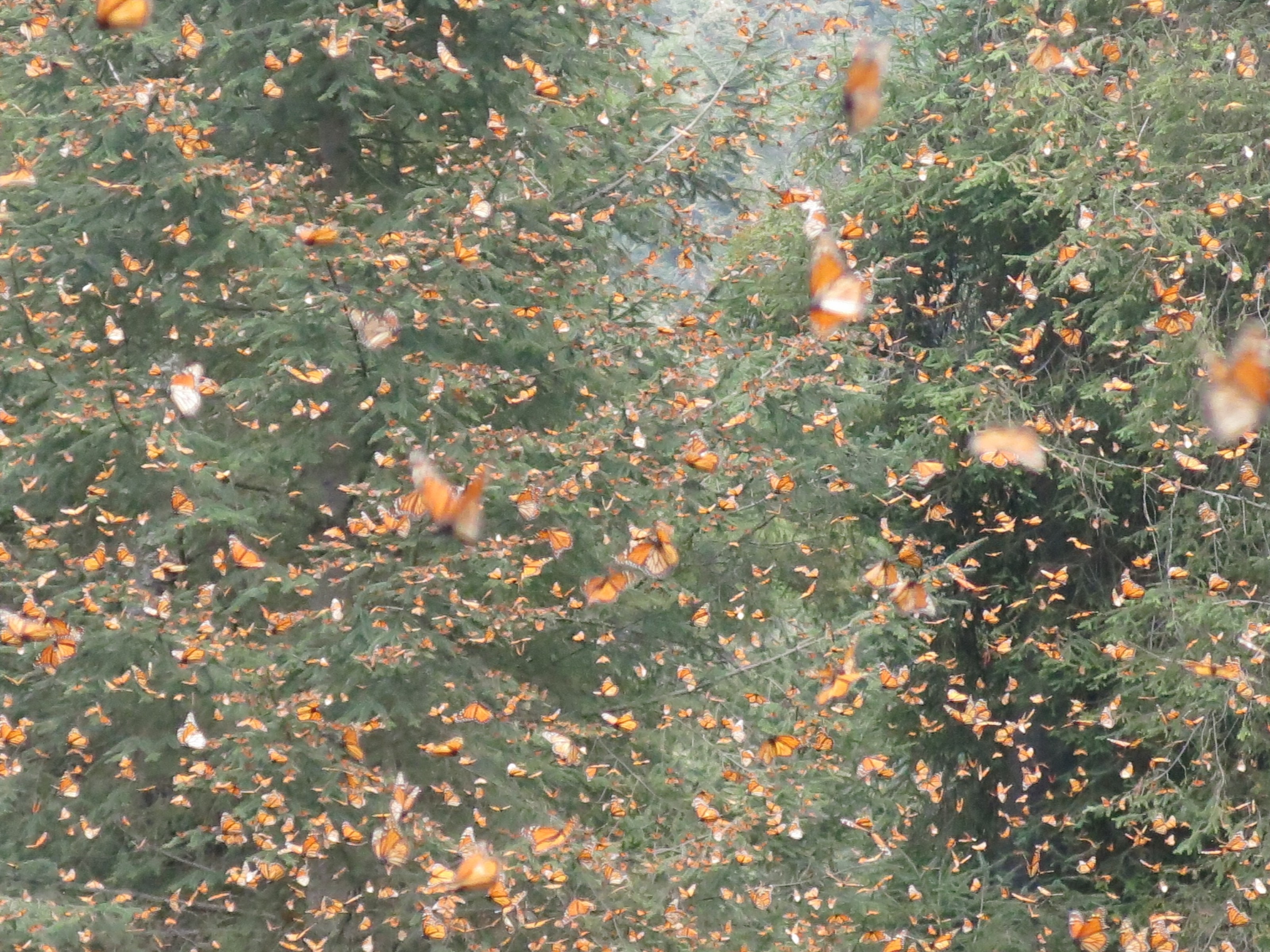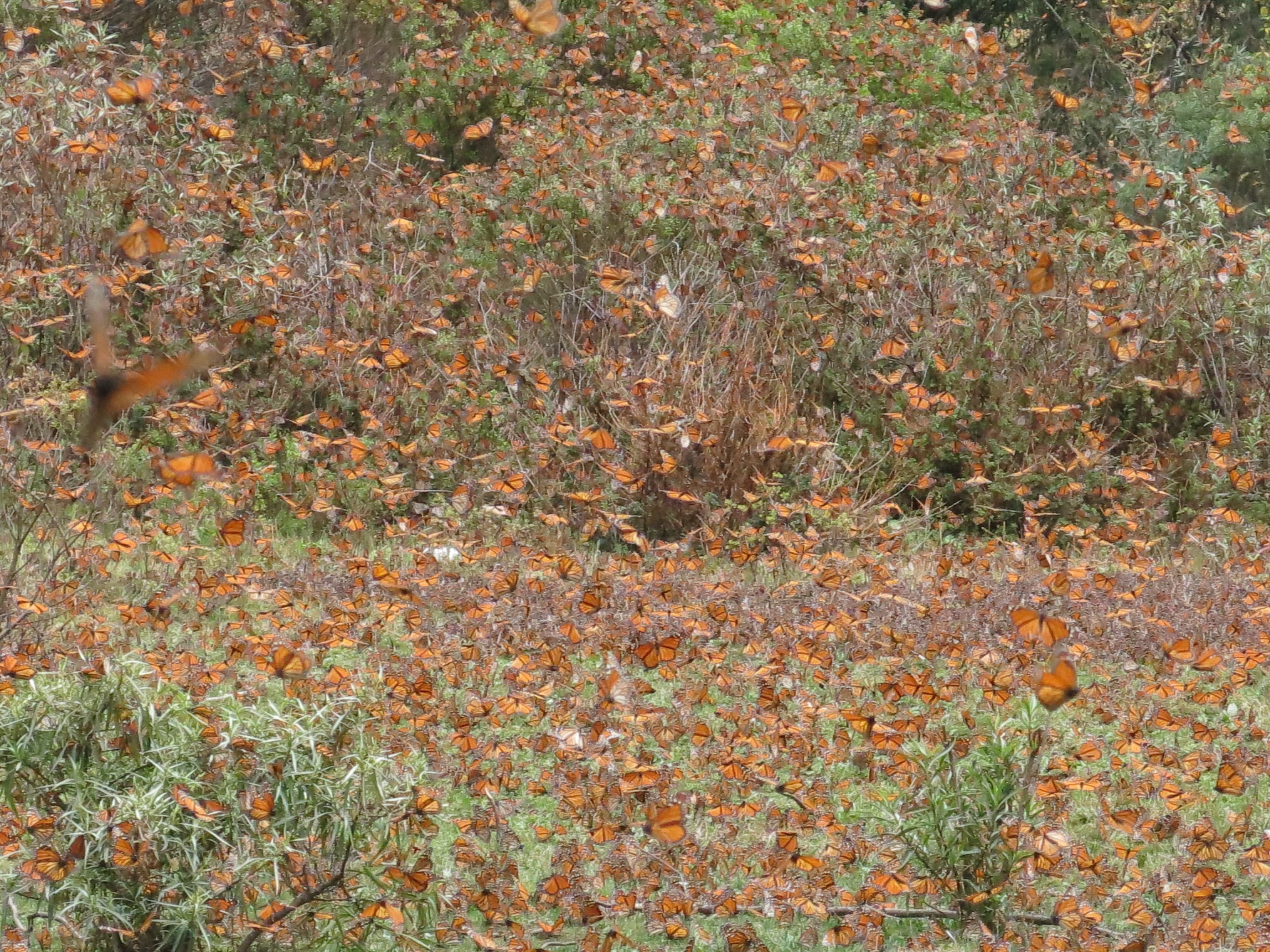 At El Rosario Sanctuary today monarchs covered the ground in a majestic orange carpet and the air was incessantly invaded by a brilliant orange veil. It was almost smothering. The butterfly activity was uninterrupted and kept us immobile, paralyzed within the next few hours. Has this been seen in the past? No, not that I remember quite like this. Nor have I seen such a contrast in a single day, between yesterday’s heavy, dense clusters at Sierra Chincua and today’s miracle in front of my eyes, with not a single cluster to be seen anywhere. Mating? Hardly possible at this incredible level of activity all day long! Only two couples could I catch mating among these many millions!