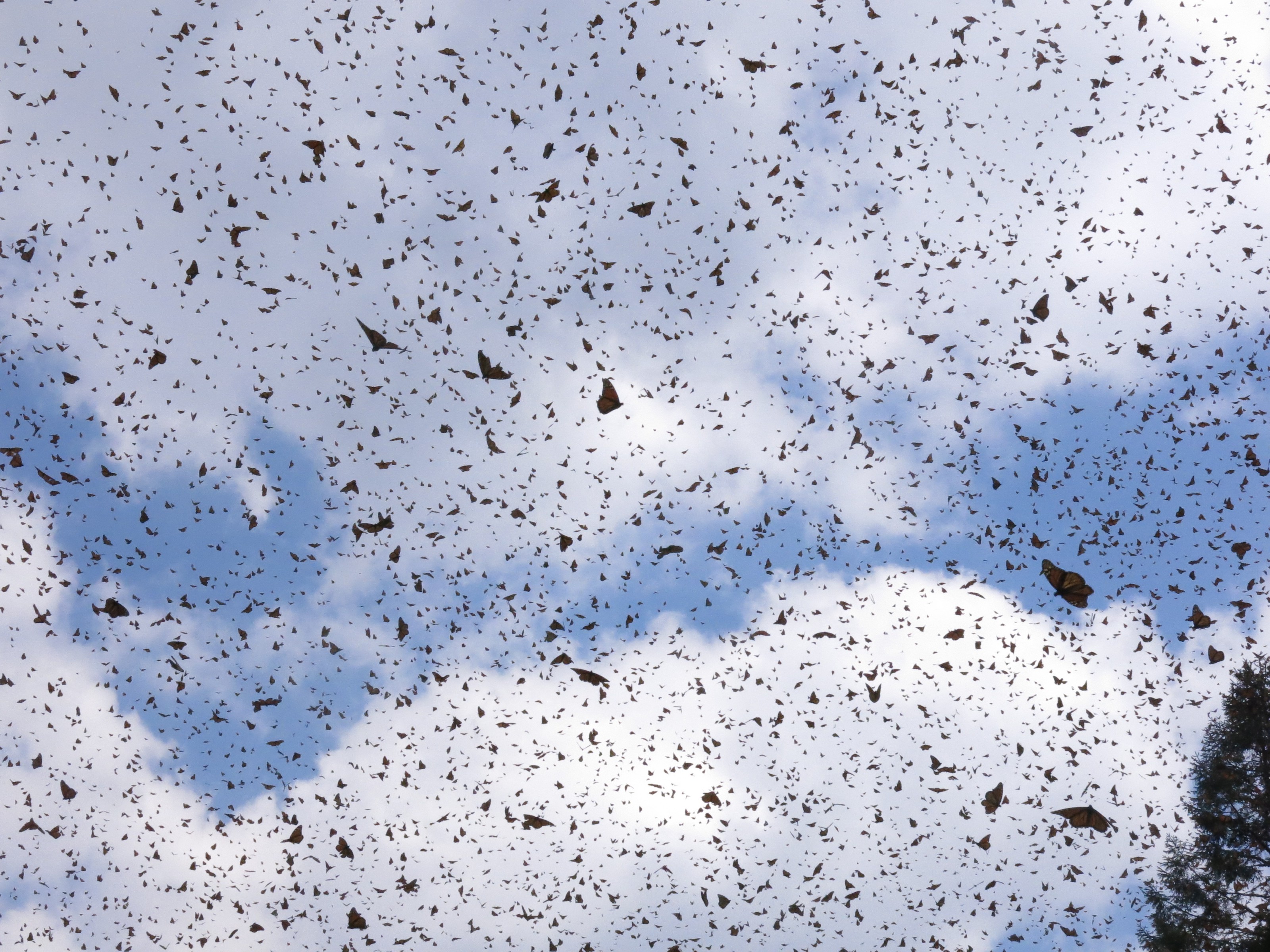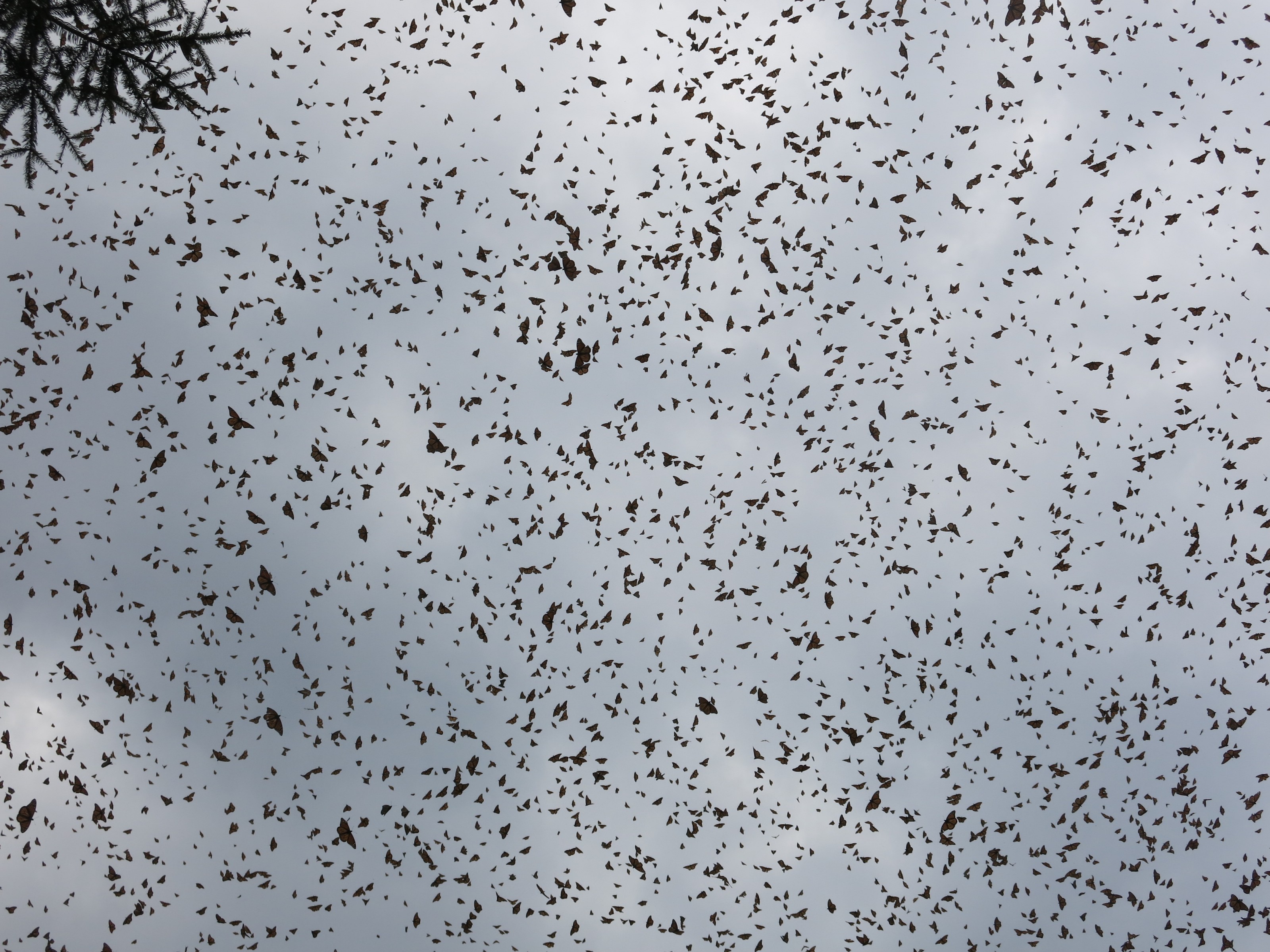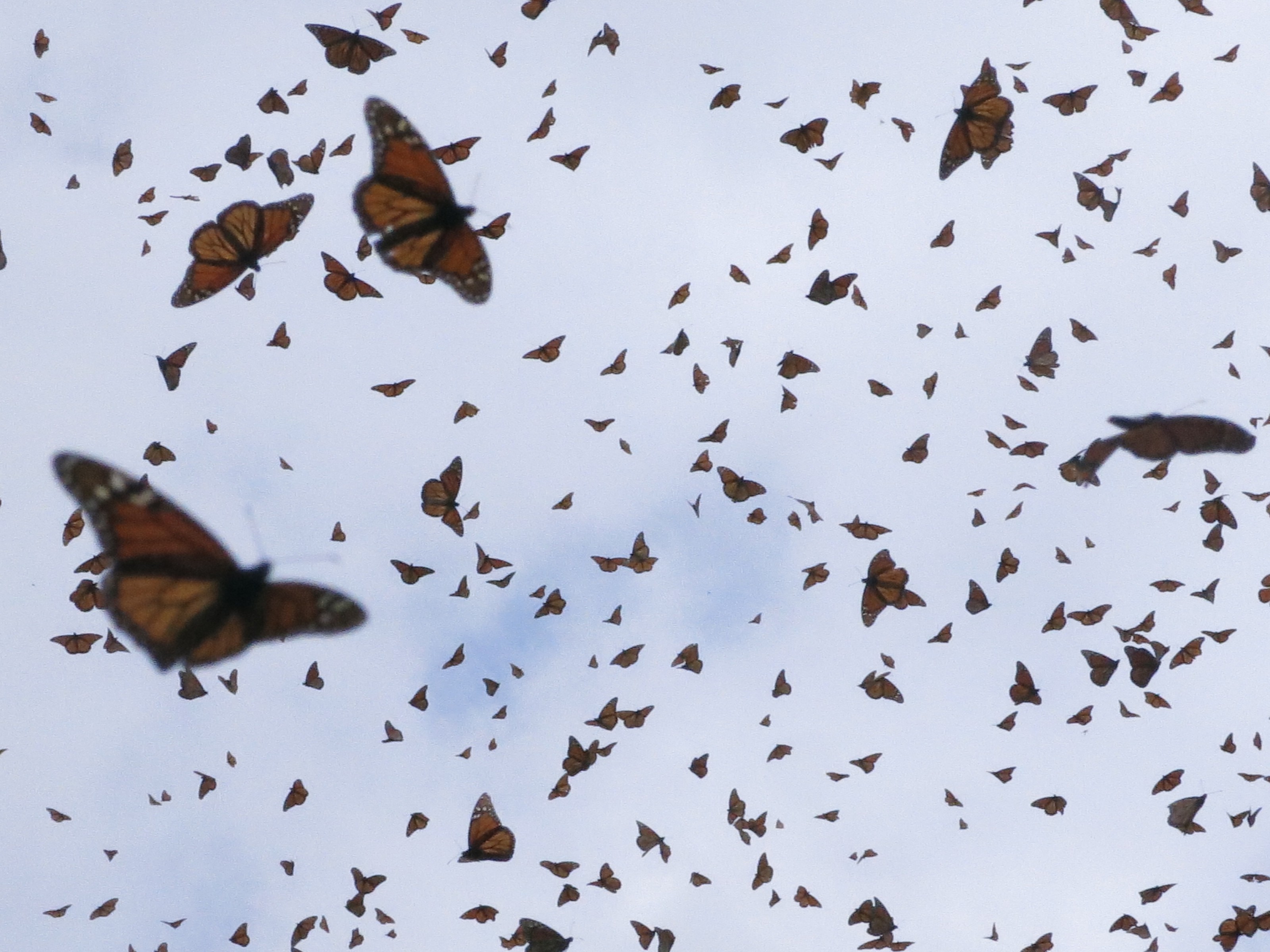 At El Rosario Sanctuary today monarchs covered the ground in a majestic orange carpet and the air was incessantly invaded by a brilliant orange veil. It was almost smothering. The butterfly activity was uninterrupted and kept us immobile, paralyzed within the next few hours. Has this been seen in the past? No, not that I remember quite like this. Nor have I seen such a contrast in a single day, between yesterday’s heavy, dense clusters at Sierra Chincua and today’s miracle in front of my eyes, with not a single cluster to be seen anywhere. Mating? Hardly possible at this incredible level of activity all day long! Only two couples could I catch mating among these many millions!