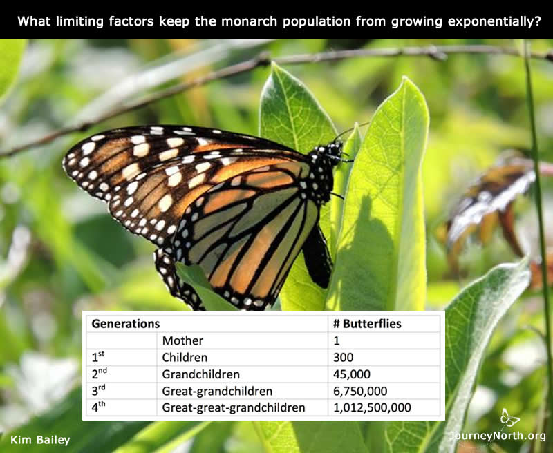 How Does the Monarch Population Grow? From Eggs to Butterflies What if all monarch eggs were to survive to become adult butterflies? How Many Survive? A female monarch butterfly can lay several hundred eggs. Let's see how quickly the numbers could grow from one monarch generation to the next. What is a Generation? A generation is one complete life cycle. A monarch can complete its life cycle in only one month. Let's count monarch generations and see how long it takes to reach a billion butterflies. One Billion Butterflies If all of her eggs survived, one monarch butterfly could produce a billion butterflies in only 4 generations. She would have over a billion great-great-grandchildren! What Limits Monarch Numbers? With such a high reproductive potential, why isn't the world swarming with billions and billions of monarchs? What factors might limit the population size? Limiting Factors Monarch numbers can rise and fall for countless reasons. Here are some examples of limiting factors: Food sources can be scarce or abundant; Enemies can be many or few; Diseases can be deadly or mild. Temperatures can be too hot or too cold; Precipitation can be too high or too low; Finding the Balance Scientists are still learning about the balance between the monarch's high reproductive potential and the factors that limit the population's growth. Probably less than 1% of all monarch eggs become butterflies, yet the population typically gets a little larger with each generation. Report Your Sightings You can help scientists learn more about monarch populations by contributing your own observations. Companion Resources Journal Image Gallery Text Only Teaching Suggestions Essential Question What limiting factors keep the monarch population from growing exponentially?