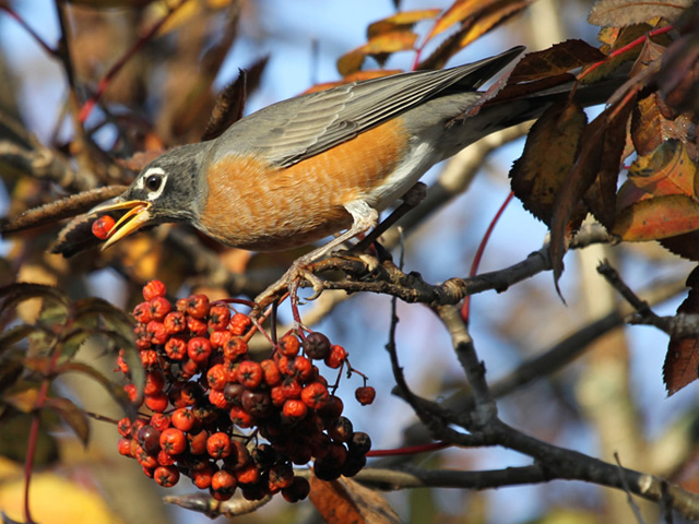 October is the month of heaviest migration. Most robins fly south in winter; however, some stick around—and move around—in northern locations where food can be found. The robins that stay will have the advantage of first choice of best territories in spring. Meanwhile, migrating robins find plentiful berries all along the journey south. Robins don't migrate on a particular route but fly in flocks, looking for food. Down feathers grow under outer feathers, adding extra insulation against winter's cold.