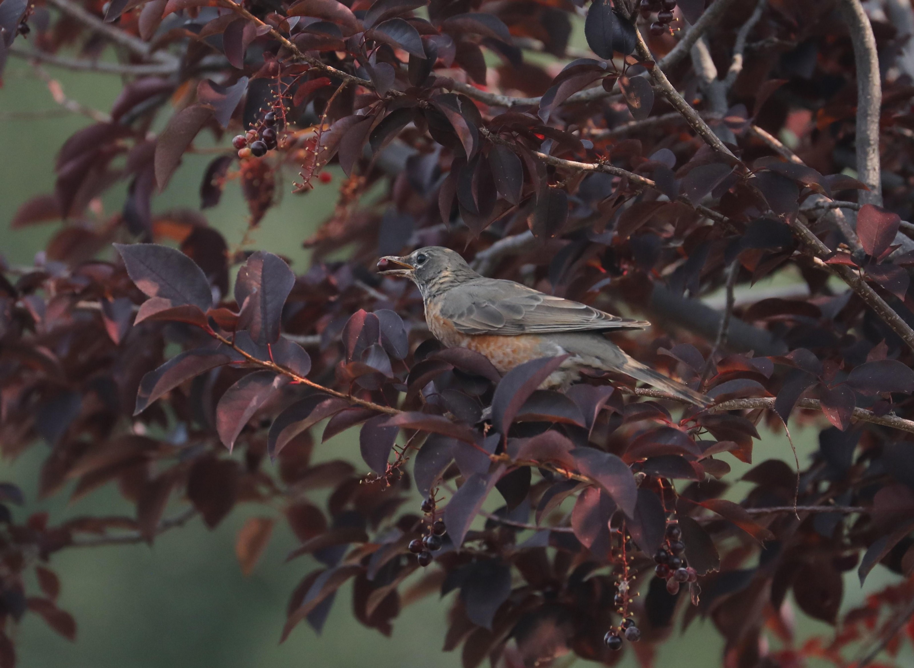 American Robins that had three or four broods may still be raising young. As day length grows shorter, robins become restless and social. Flocks of robins are on the move, filling up on plentiful fruits and juicy berries. They are building up their body fat as fuel for fall migration.