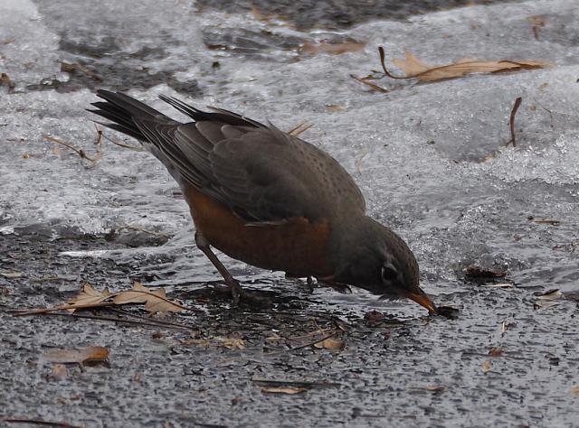 Robins feel restless, ready to migrate. Their whole body is urging them to establish a territory, mate, and raise babies--but they can't start any of these until they arrive on their breeding grounds. Increasing day length triggers their urge to return north. As days get longer and warm temperatures melt snowcover, look for signs that robins are switching from their winter diet of berries to their spring diet of earthworms. Report what changes you are seeing and hearing in your backyard habitats.
