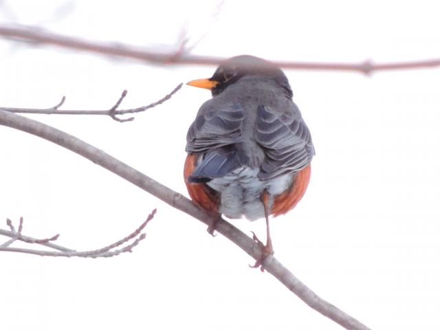 From Grande Prairie, Alberta, Canada: Margot noted, "After a couple of weeks of melting, with snow gone from most open areas (still in the woods), we had 2cm of snow on April 4. The robins were looking for food under a tree where there was no snow. Six birds were still there the following morning." (04/04/2019)