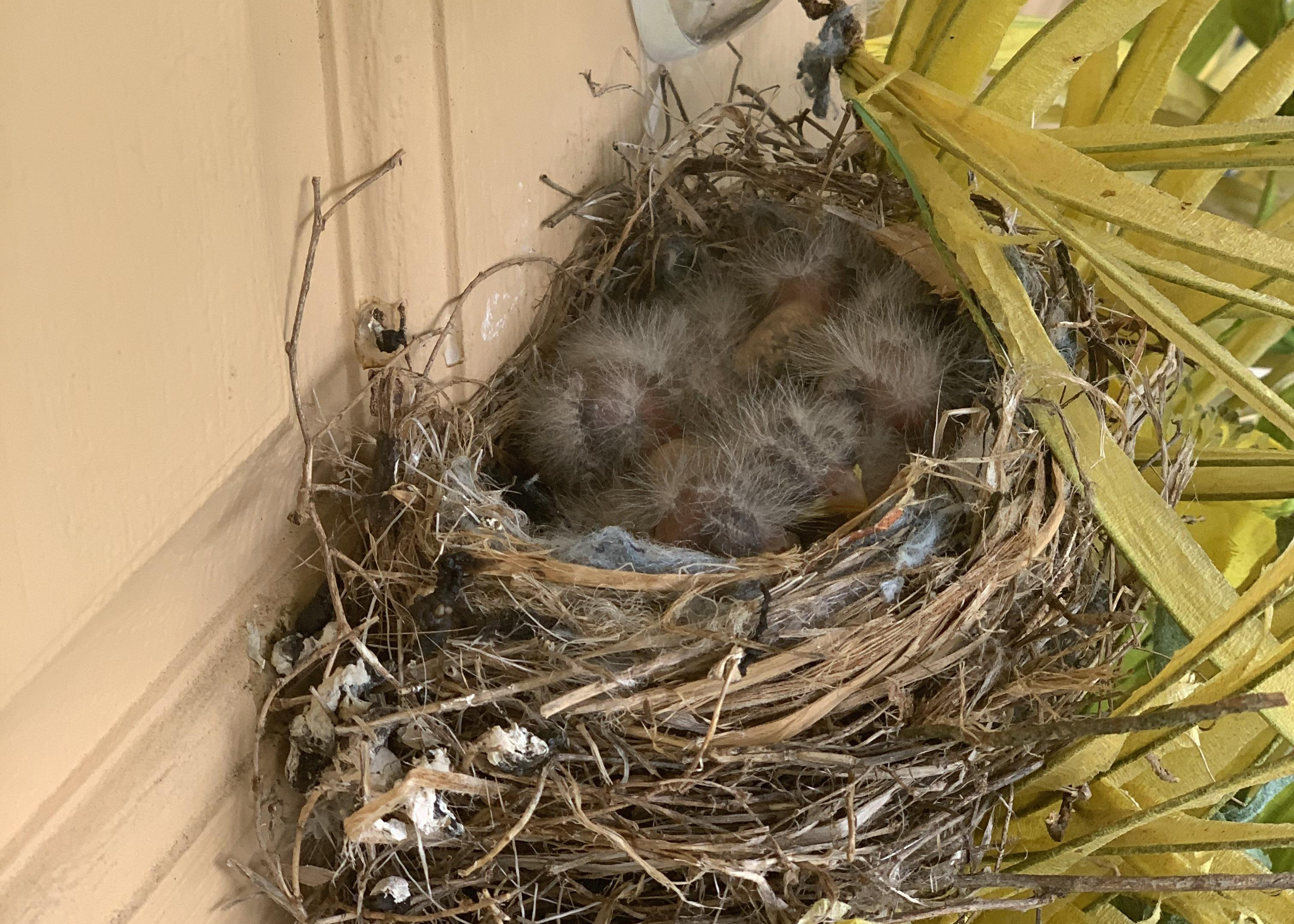 From Evansville IN: Suze shared, “They're growing fast! Mama robin trusts my coming and going. She carries on. Dad, on the other hand, screeches his displeasure.” (04/20/2020)