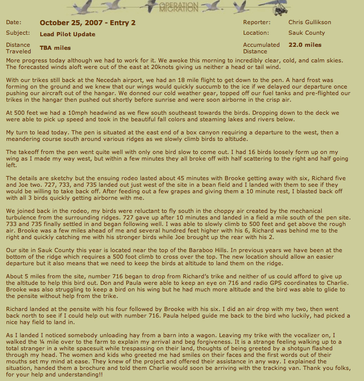 First Migration South: Chick #710 left Wisconsin for his first migration on October 13th, 2007. He flew the whole first leg of the journey and landed safely at Stopover #1! Find day-by-day news about the flock's migration and read more about #710 below.