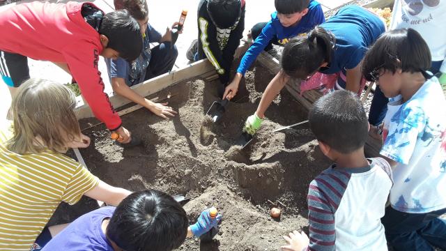 From Shakopee, MN: Marta reported "50 fourth graders...planted tulip bulbs on a hill next to the school. It was a very cloudy day with a slight breeze. We added a bit of water to each bulb and hoped for more rain over the weekend. We were happy to find worms in the soil as we dug the holes. Now the waiting begins!" (09/27/2019)