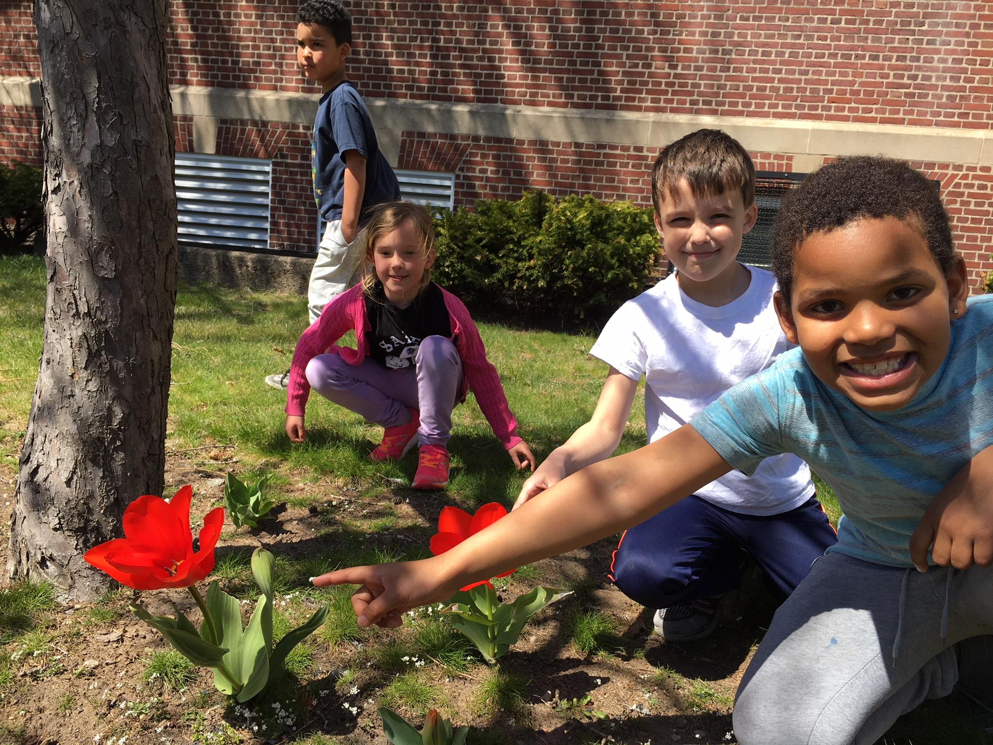 "Our tulips bloomed red. The tulip flowers opened up and there was yellow and black inside. Inside they had purple pollen. We put the pollen on our papers." Gilmanton, New Hampshire on April 30th.