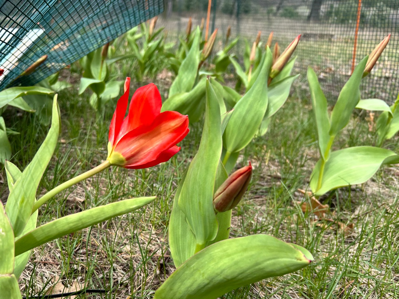 One day later, on April 23, Sarah in Saint Paul posted a photo of numerous tulips starting to bloom, writing, “The tulips face west and they are shaded by the building.”