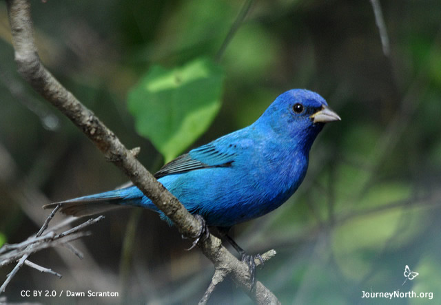 Can you see why these brilliantly colored birds are nicknamed "blue canaries?" Common and widespread through late spring and summer all over eastern North America, Indigo buntings spend winters in South America. This male is in his summer colors, while the females are brown all year round. They sing their cheery song from dawn to dusk atop the tallest perch in sight, and if you are lucky they might stop by your bird feeder in spring or summer. Photo: Dawn Scranton