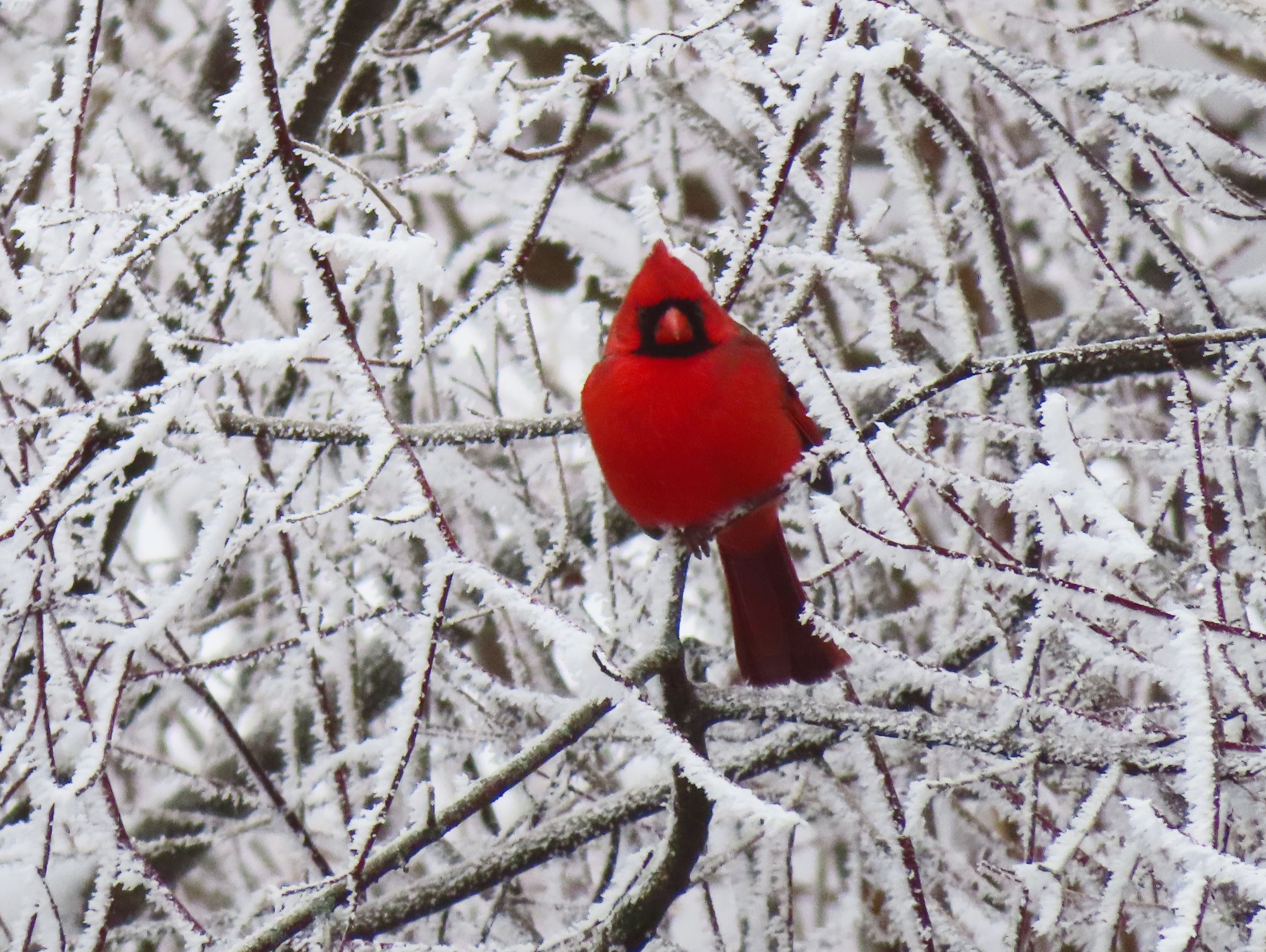 "These past couple days have been punctuated by fog and a lot of hoar frost formation on all the trees, shrubs and spent wild flowers and grasses. It’s really made for a beautiful winter wonderland. I took another photo of a bright red male Northern Cardinal perched in a bush well flocked with hoar frost." Read Chuck's Weekly Birding Report #42.